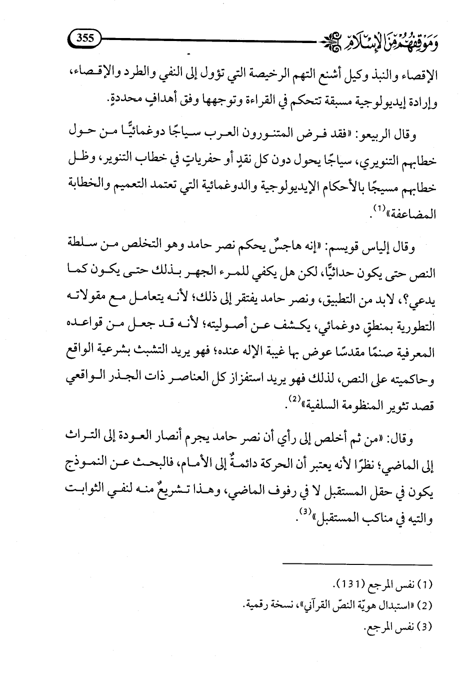 وقال: من ثم أخلص إلى رأي أن نصر حامد يجرم أنصار العودة إلى التراث إلى الماضي، نظرا لأنه يعتبر أن الحركة دائمة إلى الأمام، فالبحث عن النموذج يكون في حقل المستقبل لا في رفوف الماضي، وهذا تشريع منه لنفي الثوابت والتيه في مناكب المستقبل (¬3).