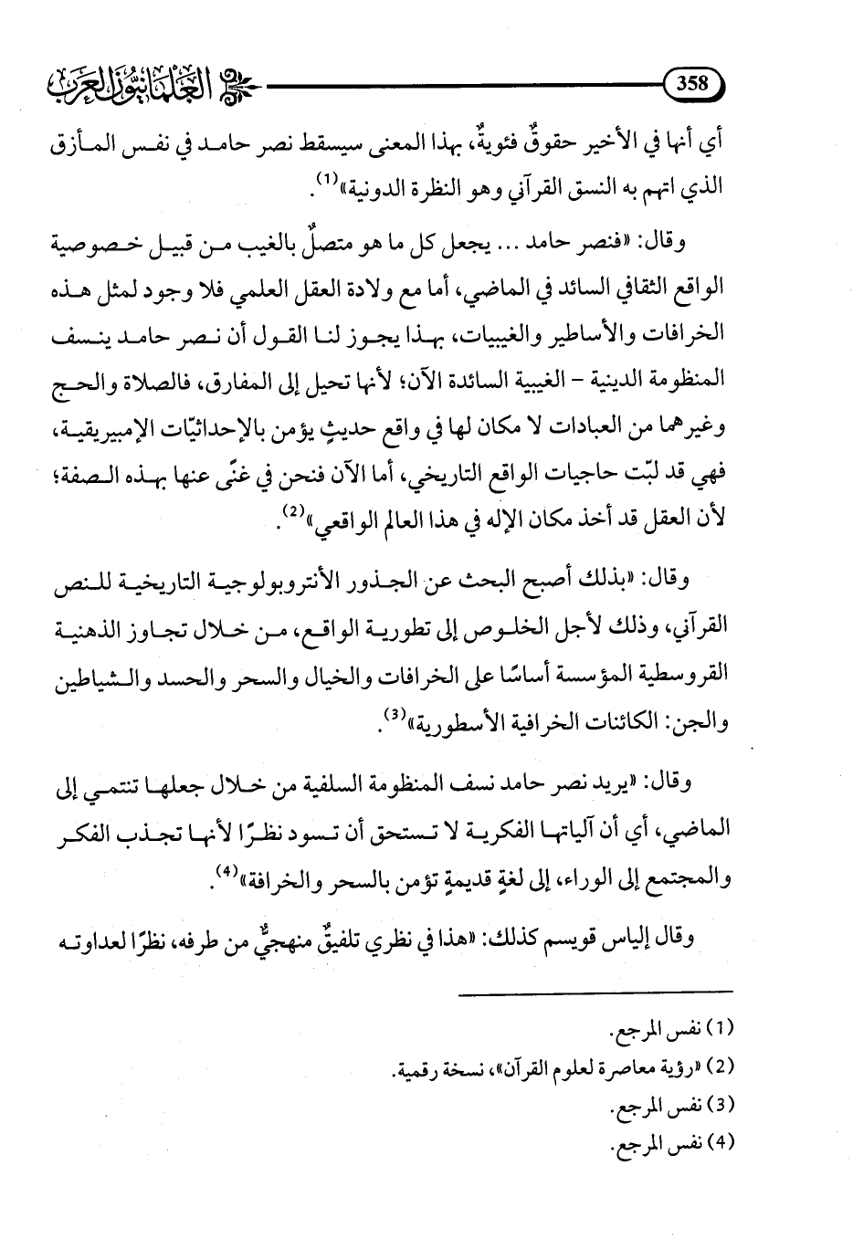 وقال: يريد نصر حامد نسف المنظومة السلفية من خلال جعلها تنتمي إلى الماضي، أي أن آلياتها الفكرية لا تستحق أن تسود نظرا لأنها تجذب الفكر والمجتمع إلى الوراء إلى لغة قديمة تؤمن بالسحر والخرافة (¬4).