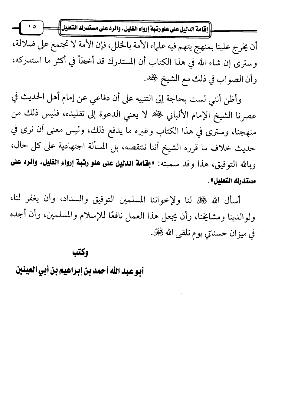 وأظن أنني لست بحاجة إلى التنبيه على أن دفاعي عن إمام أهل الحديث في عصرنا الشيخ الإِمام الألباني رحمه الله لا يعني الدعوة إلى تقليده، فليس ذلك من منهجنا، وسترى في هذا الكتاب وغيره ما يدفع ذلك، وليس معنى أن نرى في حديث خلاف ما قرره الشيخ أننا ننتقصه، بل المسألة اجتهادية على كل حال، وبالله التوفيق، هذا وقد سميته: "إقامة الدليل على علو رتبة إرواء الغليل، والرد على مستدرك التعليل".