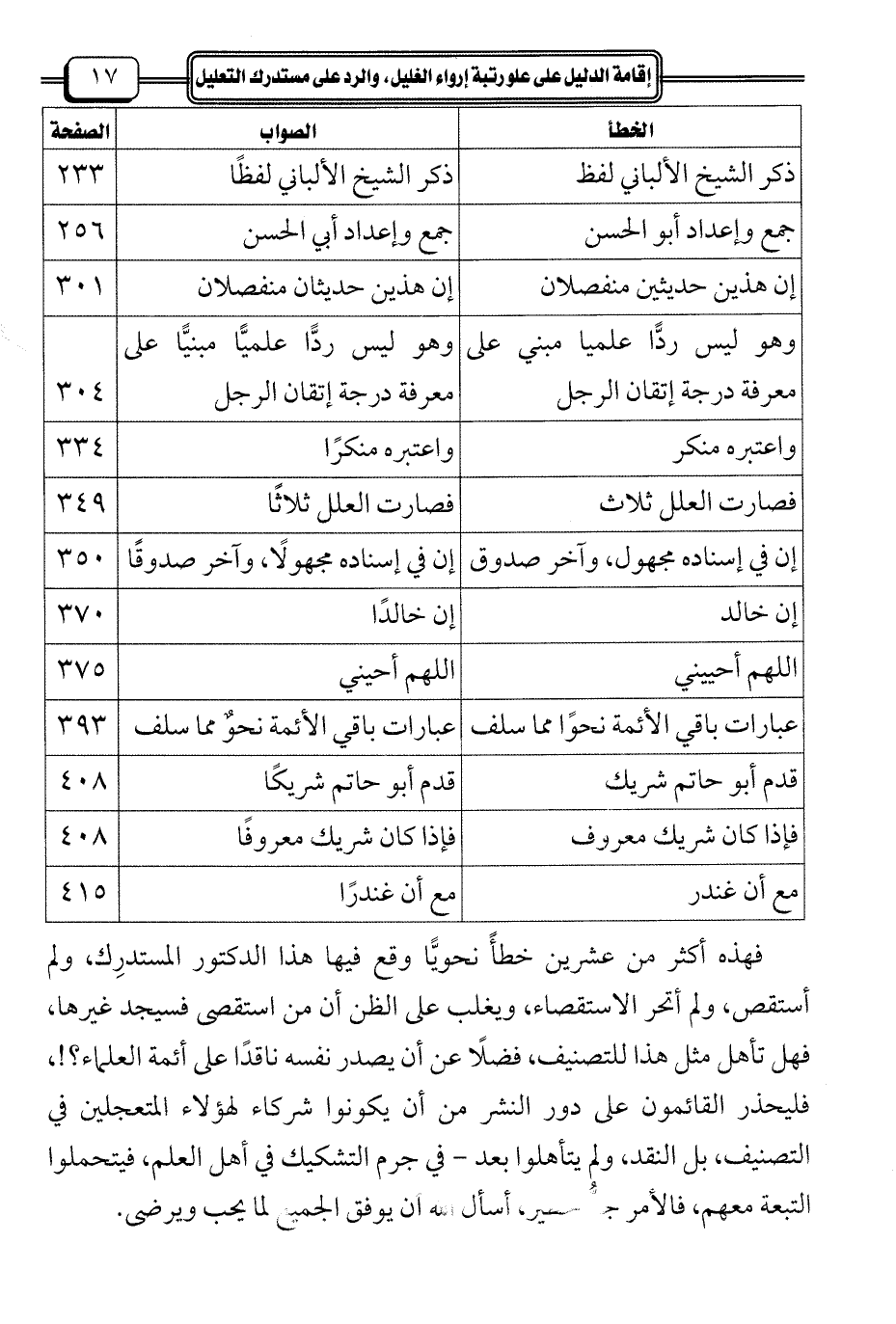 فهذه أكثر من عشرين خطأً نحويًّا وقع فيها هذا الدكتور المستدرِك، ولم أستقص، ولم أتحر الاستقصاء، ويغلب على الظن أن من استقصى فسيجد غيرها، فهل تأهل مثل هذا للتصنيف، فضلًا عن أن يصدر نفسه ناقدًا على أئمة العلماء؟!، فليحذر القائمون على دور النشر من أن يكونوا شركاء لهؤلاء المتعجلين في التصنيف، بل النقد، ولم يتأهلوا بعد - في جرم التشكيك في آهل العلم، فيتحملوا التبعة معهم، فالأمر جدُّ خطير، أسأل الله أن يوفق الجميع لما يحب ويرضى.