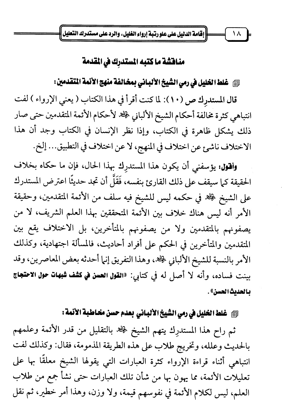 وأقول: يؤسفني أن يكون هذا المستدرِك بهذا الحال، فإن ما حكاه بخلاف الحقيقة كما سيقف على ذلك القارئ بنفسه، فَقَلَّ أن تجد حديثًا اعترض المستدرك على الشيخ رحمه الله في حكمه ليس للشيخ فيه سلف من الأئمة المتقدمين، وحقيقة الأمر أنه ليس هناك خلاف بين الأئمة المتحققين بهذا العلم الشريف، لا من يصفونهم بالمتقدمين ولا من يصفونهم بالمتأخرين، بل الاختلاف يقع بين المتقدمين والمتأخرين في الحكم على أفراد أحاديث، فالمسألة اجتهادية، وكذلك الأمر بالنسبة للشيخ الألباني رحمه الله، وهذا التفريق إنما أحدثه بعض المعاصرين، وقد بينت فساده، وأنه لا أصل له في كتابي: "القول الحسن في كشف شبهات حول الاحتجاج بالحديث الحسن".
