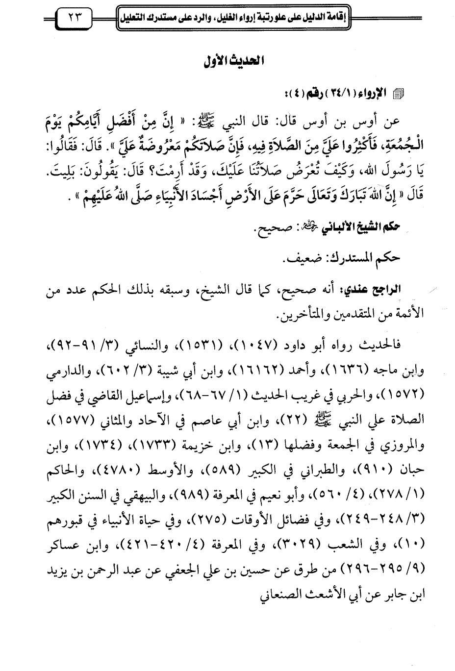 عن أوس بن أوس قال: قال النبي - صلى الله عليه وسلم -: "إِنَّ مِنْ أَفْضَلِ أيَّامِكُمْ يوْمَ الْجُمُعَةِ، فَأَكْثِرُوا عَلَيَّ مِنَ الصَّلاَةِ فِيهِ، فَإِنَّ صَلاتَكُمْ مَعْرُوضَةٌ عَليَّ". قَالَ: فَقَالُوا: يَا رَسُولَ الله، وَكَيْفَ تُعْرَضُ صَلاتُنَا عَلَيْكَ، وَقَدْ أَرِمْتَ؟ قَالَ: يَقُولُونَ: بَلِيتَ. قَالَ "إِنَّ اللهَ تَبَارَكَ وَتَعَالَى حَرَّمَ عَلَى الأَرْضِ أَجْسَادَ الأنبِيَاءِ صَلَّى اللهُ عَلَيْهِمْ".