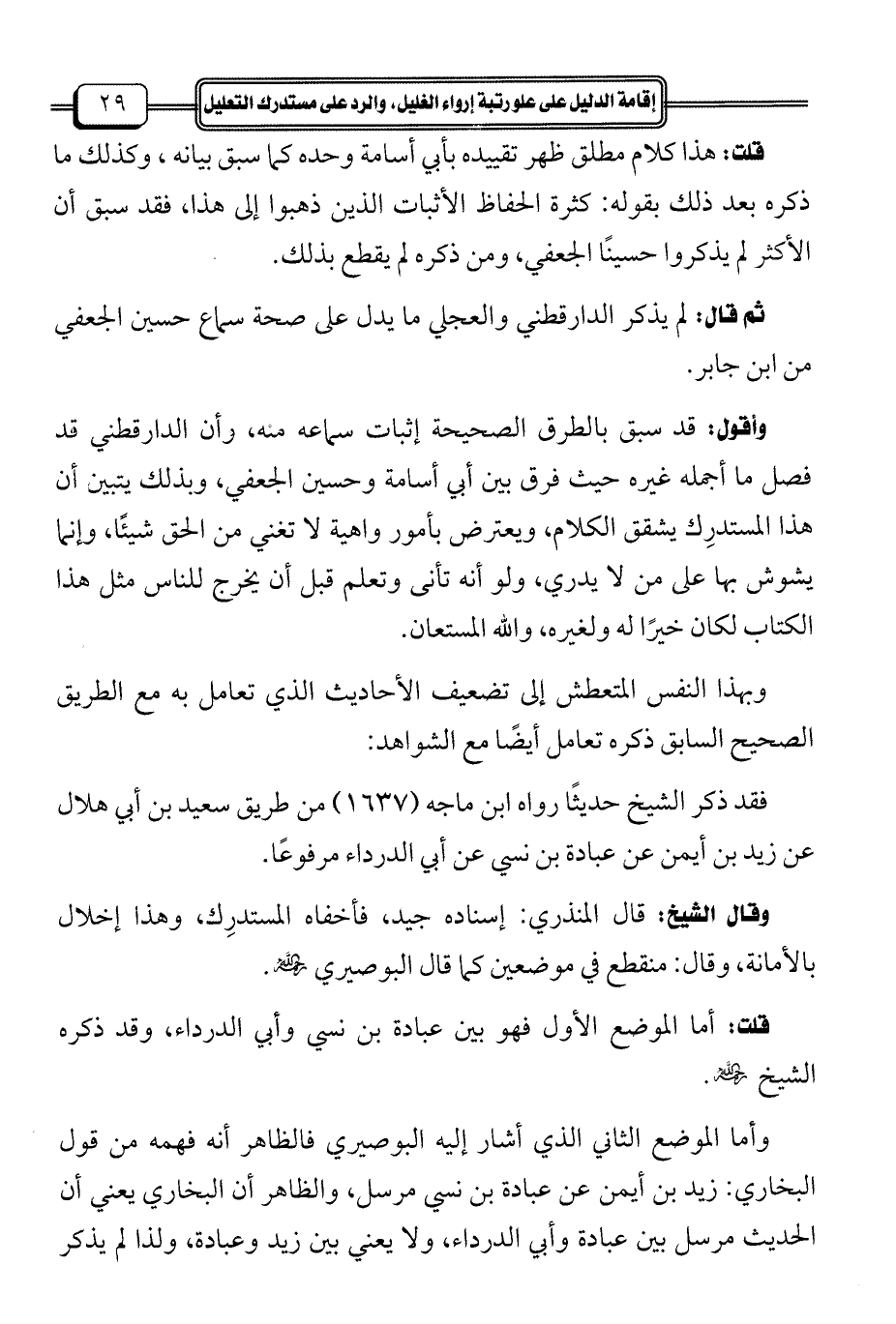 وأقول: قد سبق بالطرق الصحيحة إثبات سماعه منه، وأن الدارقطني قد فصل ما أجمله غيره حيث فرق بين أبي أسامة وحسين الجعفي، وبذلك يتبين أن هذا المستدرِك يشقق الكلام، ويعترض بأمور واهية لا تغني من الحق شيئًا، وإنما يشوش بها على من لا يدري، ولو أنه تأنى وتعلم قبل أن يخرج للناس مثل هذا الكتاب لكان خيرًا له ولغيره، والله المستعان.