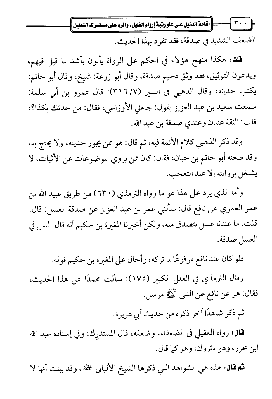 وأما الذي يرد على هذا هو ما رواه الترمذي (630) من طريق عبيد الله بن عمر العمري عن نافع قال: سألني عمر بن عبد العزيز عن صدقة العسل: قال: قلت: ما عندنا عسل نتصدق منه، ولكن أخبرنا المغيرة بن حكيم أنه قال: ليس في العسل صدقة.