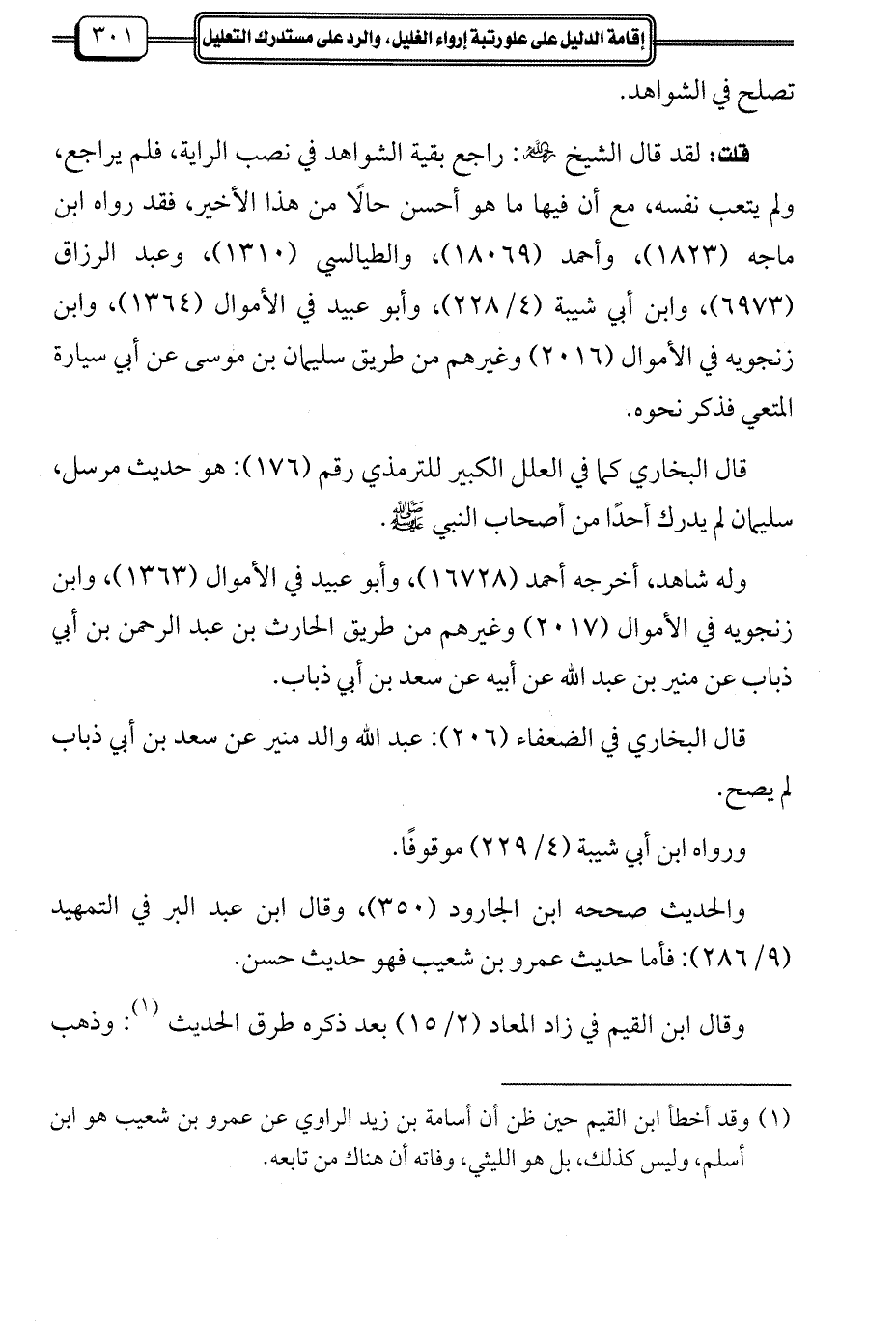 (¬1) وقد أخطأ ابن القيم حين ظن أن أسامة بن زيد الراوي عن عمرو بن شعيب هو ابن أسلم، وليس كذلك، بل هو الليثي، وفاته أن هناك من تابعه.