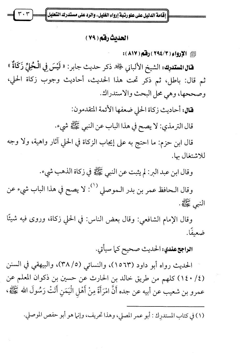 قال المستدرك: الشيخ الألباني رحمه الله ذكر حديث جابر: "لَيْسَ فِي الْحِليِّ زَكَاةٌ" ثم قال: باطل، ثم ذكر تحت هذا الحديث، أحاديث وجوب زكاة الحلي، وصححها، وهي محل البحث والاستدراك.