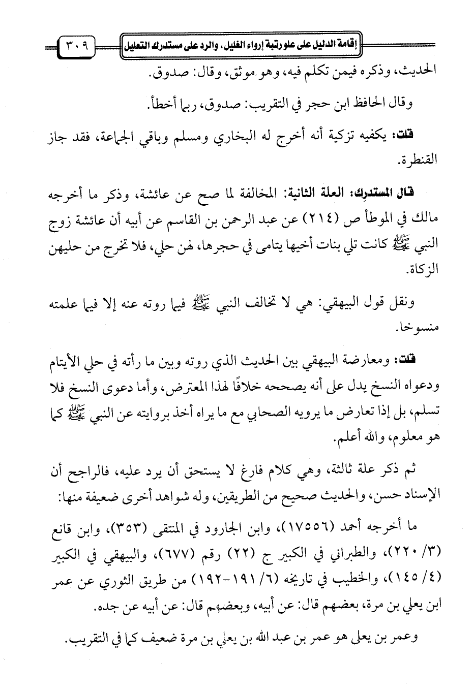 قلت: ومعارضة البيهقي بين الحديث الذي روته وبين ما رأته في حلي الأيتام ودعواه النسخ يدل على أنه يصححه خلافًا لهذا المعترض، وأما دعوى النسخ فلا تسلم، بل إذا تعارض ما يرويه الصحابي مع ما يراه أخذ بروايته عن النبي-صلى الله عليه وسلم- كما هو معلوم، والله أعلم.