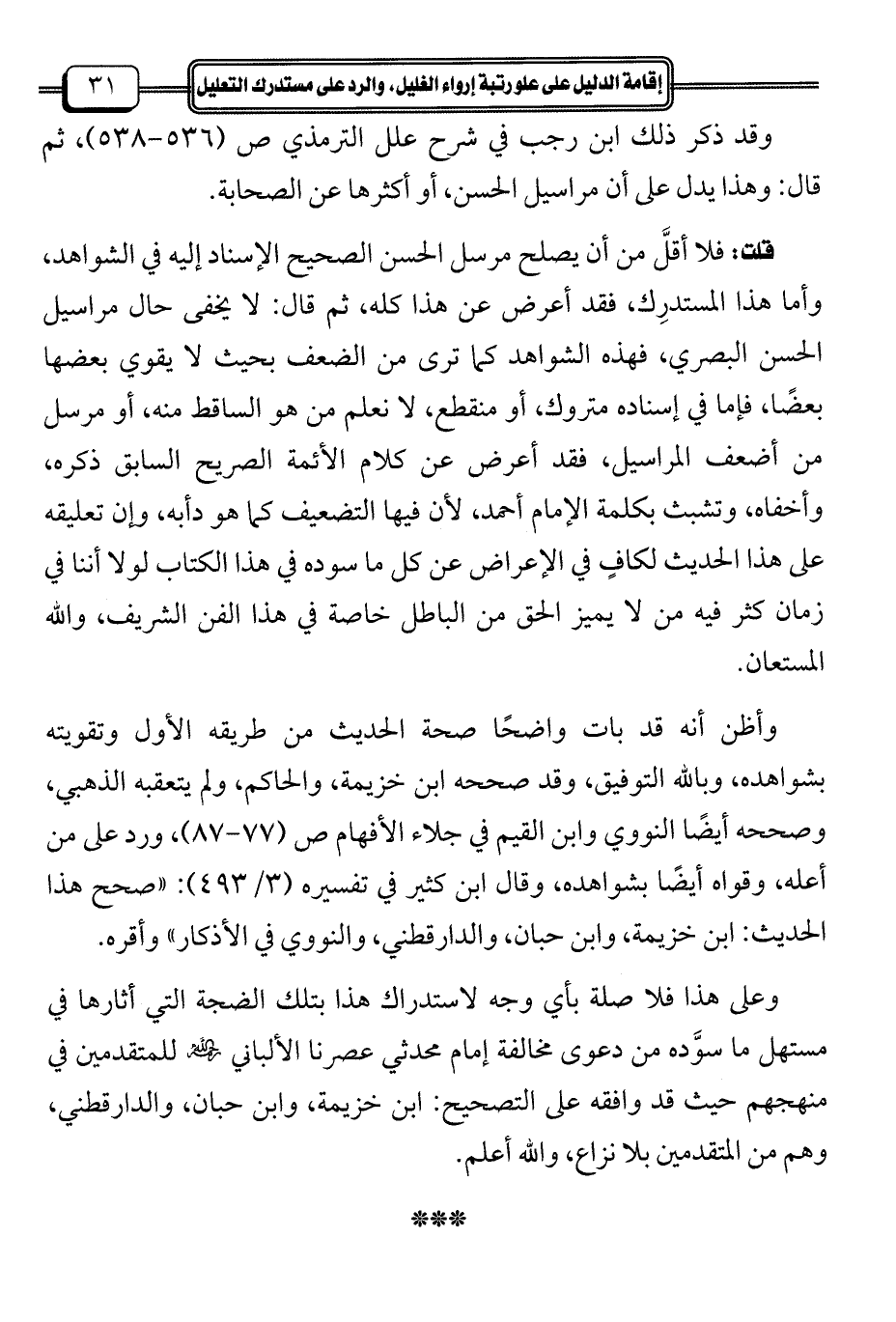 قلت: فلا أقلَّ من أن يصلح مرسل الحسن الصحيح الإسناد إليه في الشواهد، وأما هذا المستدرِك، فقد أعرض عن هذا كله، ثم قال: لا يخفى حال مراسيل الحسن البصري، فهذه الشواهد كما ترى من الضعف بحيث لا يقوي بعضها بعضًا، فإما في إسناده متروك، أو منقطع، لا نعلم من هو الساقط منه، أو مرسل من أضعف المراسيل، فقد أعرض عن كلام الأئمة الصريح السابق ذكره، وأخفاه، وتشبث بكلمة الإِمام أحمد، لأن فيها التضعيف كما هو دأبه، وإن تعليقه على هذا الحديث لكافٍ في الإعراض عن كل ما سوده في هذا الكتاب لولا أننا في زمان كثر فيه من لا يميز الحق من الباطل خاصة في هذا الفن الشريف، والله المستعان.