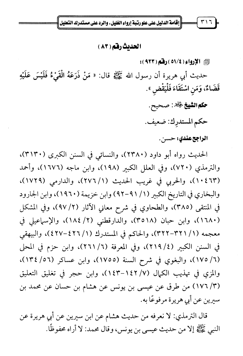 حديث أبي هريرة أن رسول الله - صلى الله عليه وسلم - قال: "مَنْ ذَرَعَهُ الْقَيْءُ فَلَيْسَ عَلَيْهِ قَضَاءٌ، وَمَنِ اسْتَقَاءَ فَلْيَقْضِ".