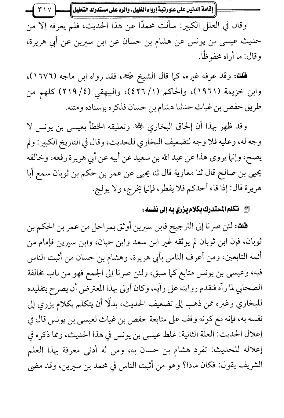 قلت: لئن صرنا إلى الترجيح فابن سيرين أوثق بمراحل من عمر بن الحكم بن ثوبان، فإن ابن ثوبان لم يوثقه غير ابن سعد وابن حبان، وابن سيرين فإمام من أئمة التابعين، ومن أعرف الناس بأبي هريرة، وهشام بن حسان من أثبت الناس فيه، وعيسى بن يونس متابع كما سبق، ولئن صرنا إلى الجمع فهو من باب مخالفة الصحابي لما رآه فتقدم روايته على رأيه، وكان أولى بهذا المعترض أن يصرح بتقليده للبخاري وغيره ممن ذهب إلى تضعيف الحديث، بدلاً أن يتكلم بكلام يزري إلى نفسه به، فإنه مع كونه وقف على متابعة حفص بن غياث لعيسى بن يونس قال في إعلال الحديث: العلة الثانية: غلط عيسى بن يونس في هذا الحديث، ومما ذكره في إعلاله للحديث: تفرد هشام بن حسان به، ومن له أدنى معرفة بهذا العلم الشريف يقول: فكان ماذا؟ وهو من أثبت الناس في محمد بن سيرين، وقد مضى