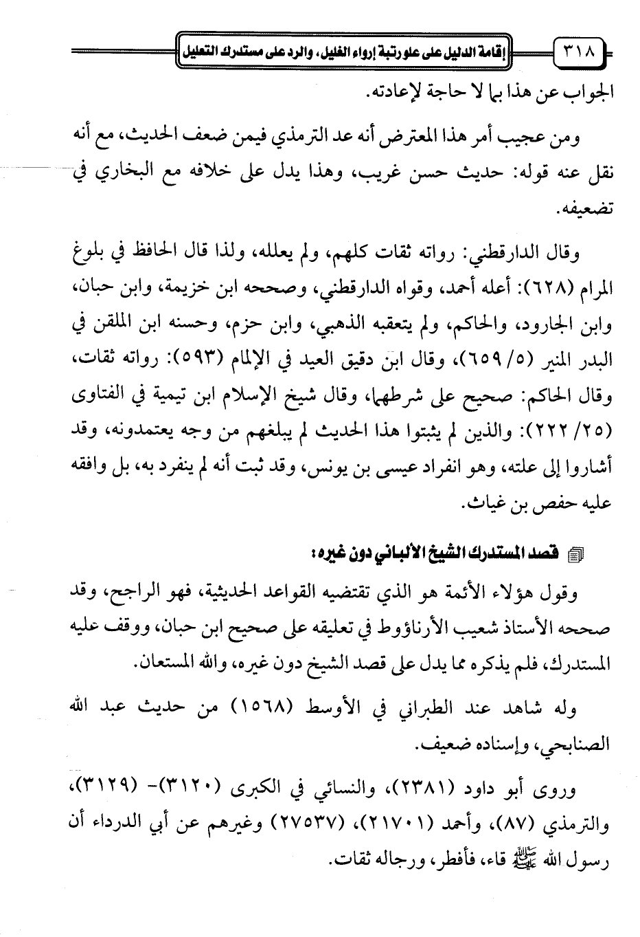 وقول هؤلاء الأئمة هو الذي تقتضيه القواعد الحديثية، فهو الراجح، وقد صححه الأستاذ شعيب الأرناؤوط في تعليقه على صحيح ابن حبان، ووقف عليه المستدرك، فلم يذكره مما يدل على قصد الشيخ دون غيره، والله المستعان.
