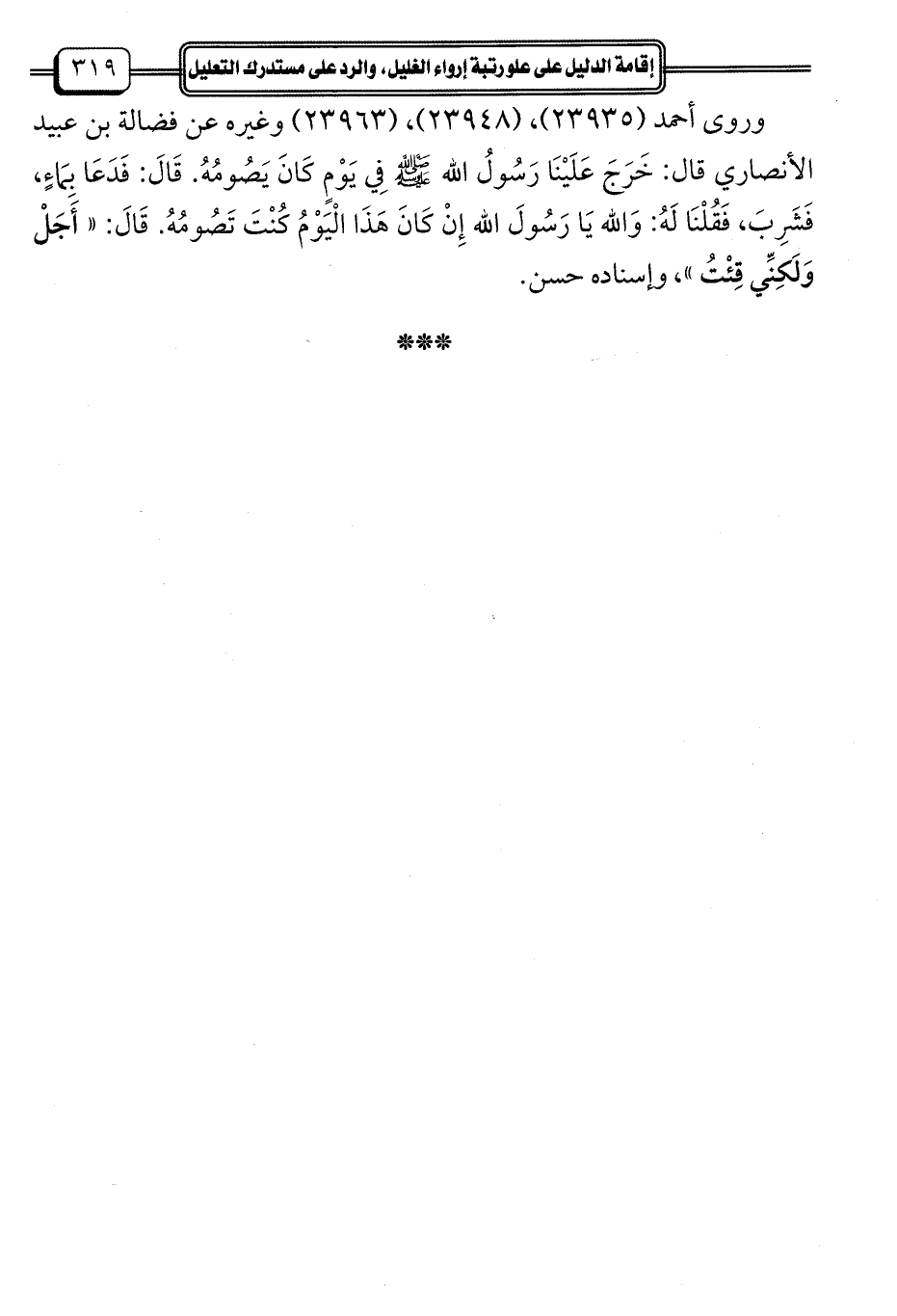 وروى أحمد (23935)، (23948)، (23963) وغيره عن فضالة بن عبيد الأنصاري قال: خَرَجَ عَلَيْنَا رَسُولُ الله - صلى الله عليه وسلم - فِي يَوْمٍ كَانَ يَصُومُهُ. قَالَ: فَدَعَا بِمَاءٍ، فَشَرِبَ، فَقُلْنَا لَهُ: وَالله يَا رَسُولَ الله إِنْ كَانَ هَذَا الْيَوْمُ كُنْتَ تَصُومُهُ. قَالَ: "أَجَلْ وَلَكِنِّي قِئْتُ"، وإسناده حسن.
