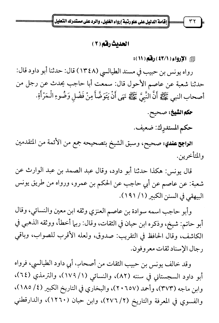 وقد خالف يونس بن حبيب الثقات من أصحاب، أبي داود الطيالسي، فرواه أبو داود السجستاني في سننه (82)، والنسائي (1/ 179)، والترمذي (64)، وابن ماجه (373)، وأحمد (20657)، والبخاري في التاريخ الكبير (4/ 185)، والفسوي في المعرفة والتاريخ (2/ 276)، وابن حبان (1260)، والدارقطني