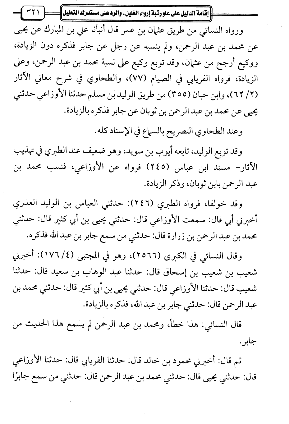 وقال النسائي في الكبرى (2566)، وهو في المجتبى (4/ 176): أخبرني شعيب بن شعيب بن إسحاق قال: حدثنا عبد الوهاب بن سعيد قال: حدثنا شعيب قال: حدثنا الأوزاعي قال: حدثني يحيى بن أبي كثير قال: حدثني محمد بن عبد الرحمن قال: حدثني جابر بن عبد الله، فذكره بالزيادة.