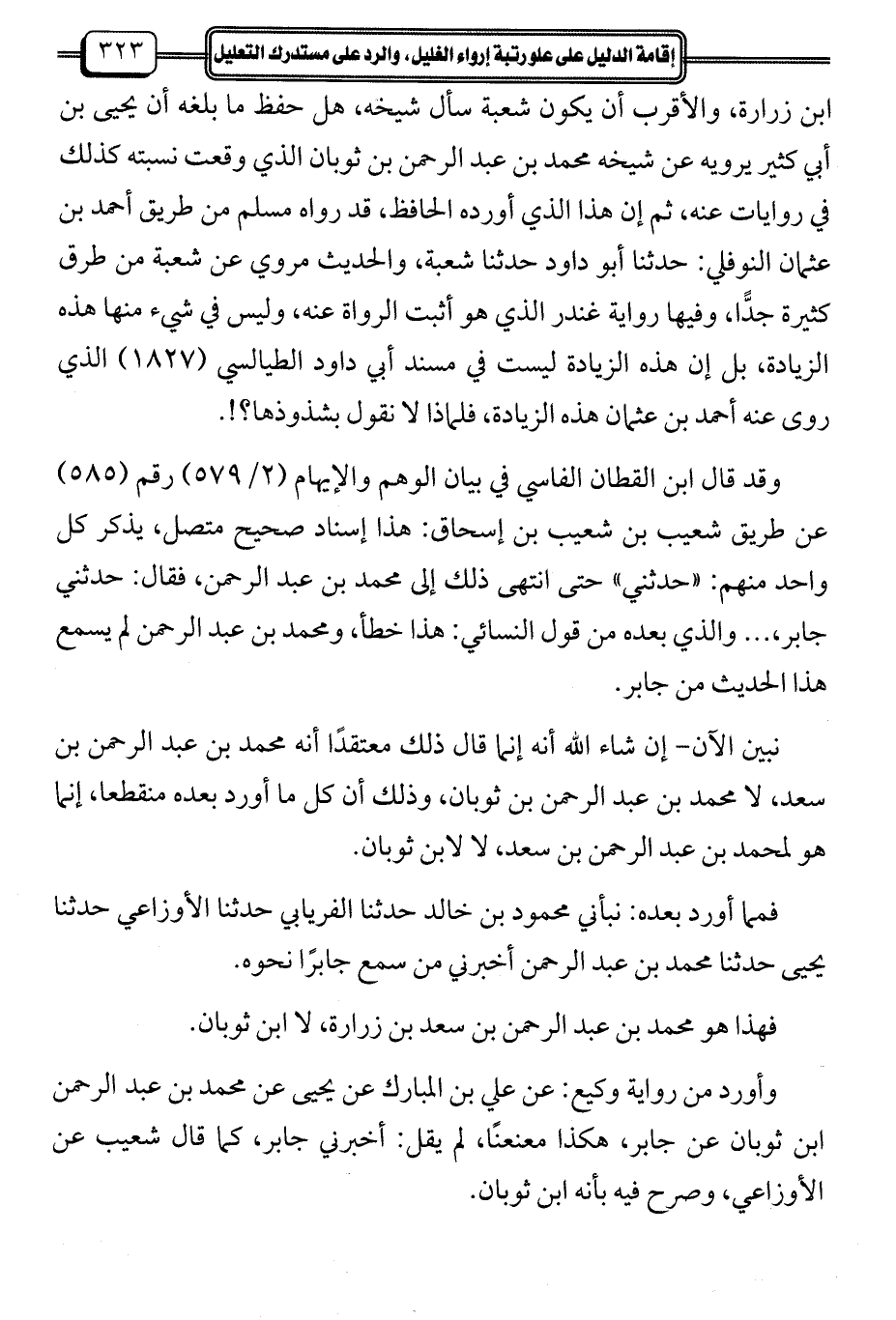 ابن زرارة، والأقرب أن يكون شعبة سأل شيخه، هل حفظ ما بلغه أن يحيى بن أبي كثير يرويه عن شيخه محمد بن عبد الرحمن بن ثوبان الذي وقعت نسبته كذلك في روايات عنه، ثم إن هذا الذي أورده الحافظ، قد رواه مسلم من طريق أحمد بن عثمان النوفلي: حدثنا أبو داود حدثنا شعبة، والحديث مروي عن شعبة من طرق كثيرة جدًّا، وفيها رواية غندر الذي هو أثبت الرواة عنه، وليس في شيء منها هذه الزيادة، بل إن هذه الزيادة ليست في مسند أبي داود الطيالسي (1827) الذي روى عنه أحمد بن عثمان هذه الزيادة، فلماذا لا نقول بشذوذها؟!.