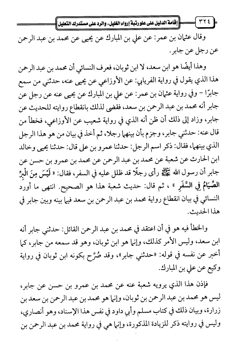 وهذا أيضًا هو ابن سعد، لا ابن ثوبان، فعرف النسائي أن محمد بن عبد الرحمن هذا الذي يقول في رواية الفريابي: عن الأوزاعي عن يحيى عنه، حدثني من سمع جابرًا -وفي رواية عثمان بن عمر: عن علي بن المبارك عن يحيى عنه عن رجل عن جابر أنه محمد بن عبد الرحمن بن سعد، فقضى لذلك بانقطاع روايته للحديث عن جابر، وزاد إلى ذلك أن ظن أنه الذي في رواية شعيب عن الأوزاعي، فخطأ من قال عنه: حدثني جابر، وجزم بأن بينهما رجلاً، ثم أخذ في بيان من هو هذا الرجل الذي بينهما، فقال: ذكر اسم الرجل: حدثنا عمرو بن علي قال: حدثنا يحيى وخالد ابن الحارث عن شعبة عن محمد بن عبد الرحمن عن محمد بن عمرو بن حسن عن جابر أن رسول الله - صلى الله عليه وسلم - رأى رجلاً قد ظلل عليه في السفر، فقال: "لَيْسَ مِنَ الْبِرِّ الصِّيَامُ فِي السَّفَرِ"، ثم قال: حديث شعبة هذا هو الصحيح. انتهى ما أورد النسائي في بيان انقطاع رواية محمد بن عبد الرحمن بن سعد فيما بينه وبين جابر في هذا الحديث.