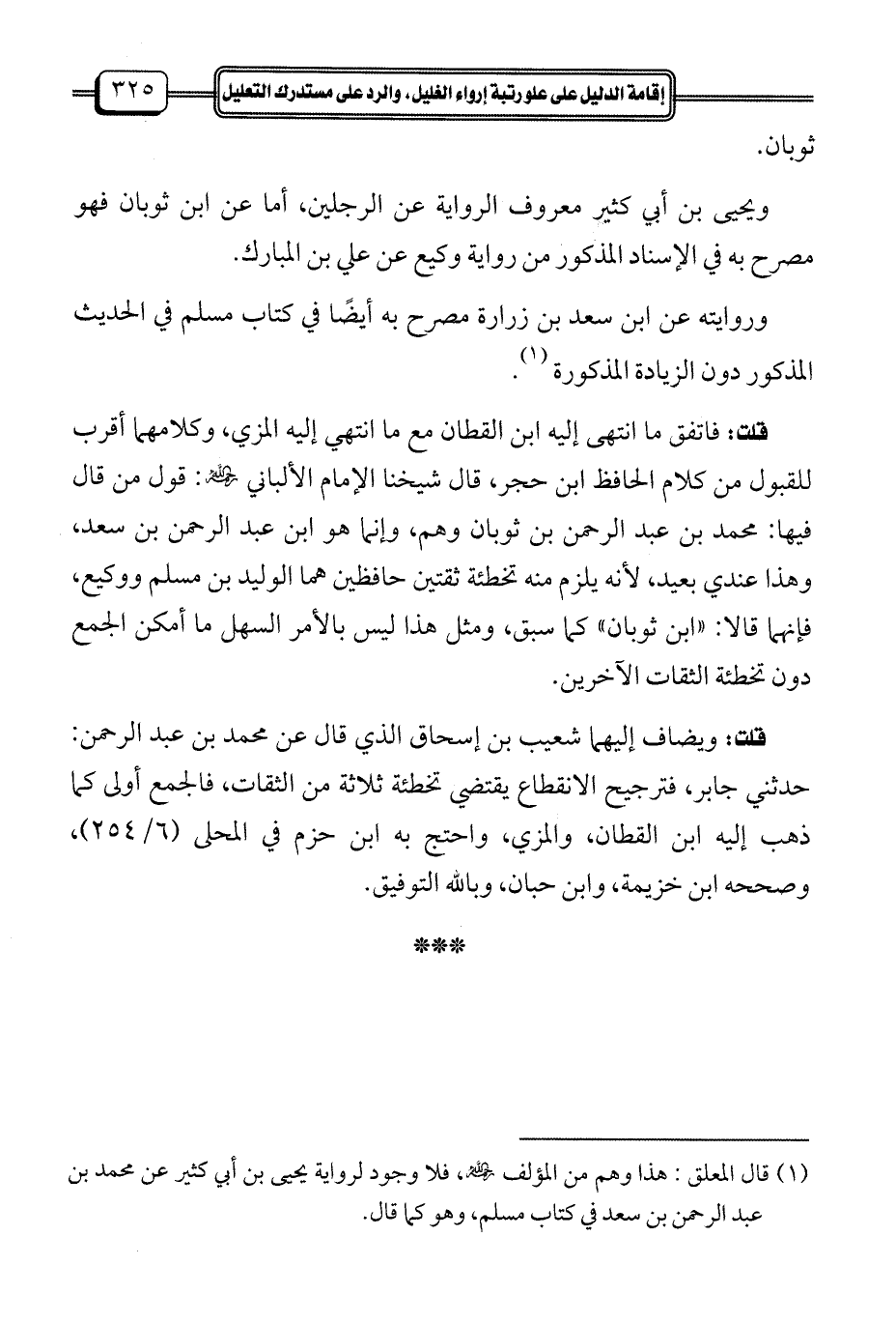 قلت: فاتفق ما انتهى إليه ابن القطان مع ما انتهي إليه المزي، وكلامهما أقرب للقبول من كلام الحافظ ابن حجر، قال شيخنا الإمام الألباني رحمه الله: قول من قال فيها: محمد بن عبد الرحمن بن ثوبان وهم، وإنما هو ابن عبد الرحمن بن سعد، وهذا عندي بعيد، لأنه يلزم منه تخطئة ثقتين حافظين هما الوليد بن مسلم ووكيع، فإنهما قالا: "ابن ثوبان" كما سبق، ومثل هذا ليس بالأمر السهل ما أمكن الجمع دون تخطئة الثقات الآخرين.
