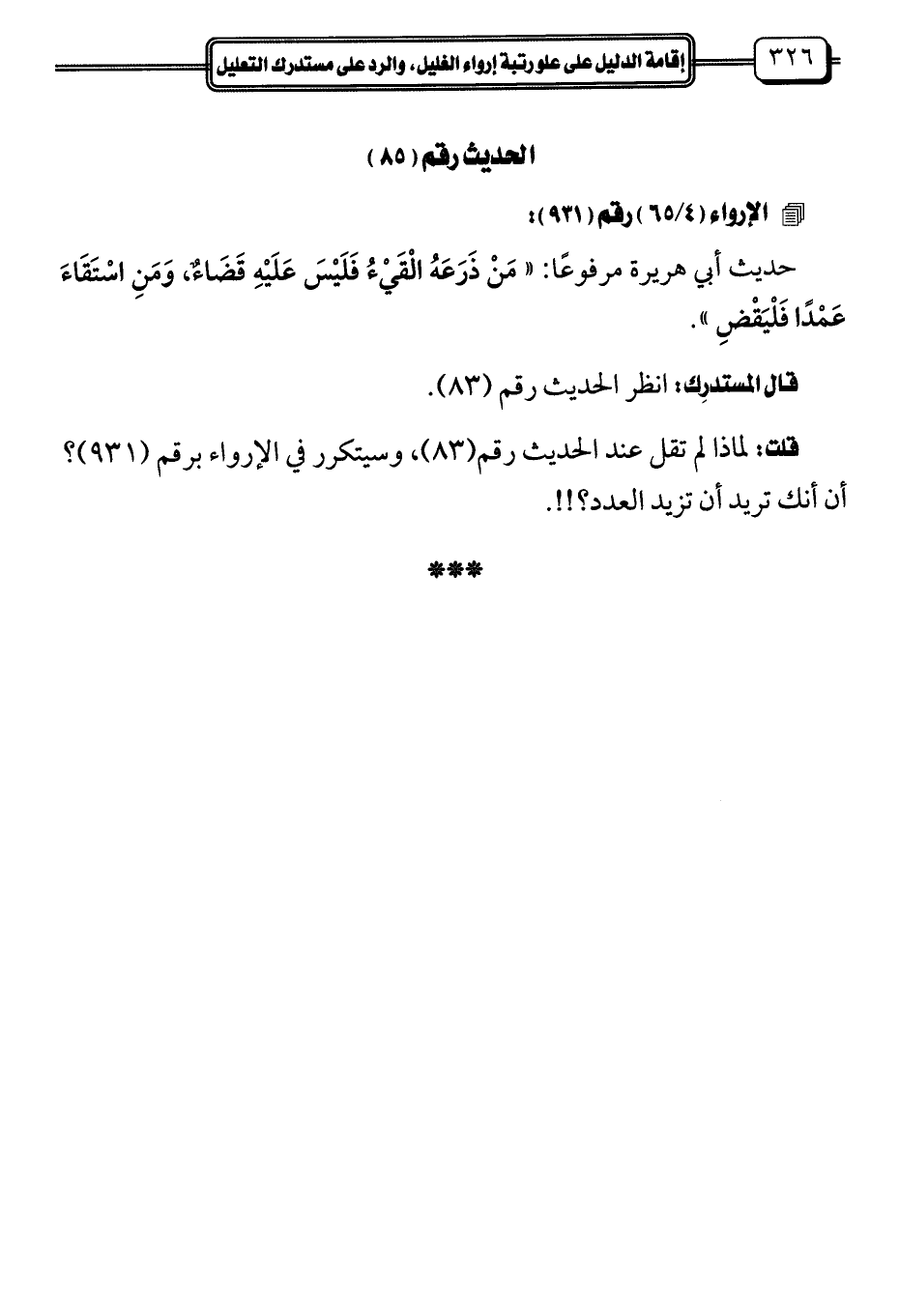 قلت: لماذا لم تقل عند الحديث رقم (83)، وسيتكرر في الإرواء برقم (931)؟ أم أنك تريد أن تزيد العدد؟!!.