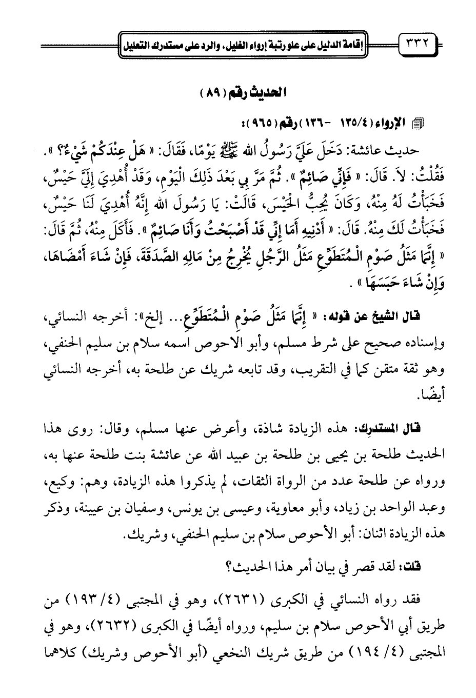 قال الشيخ عن قوله: "إِنَّما مَثَلُ صَوْمِ الْمُتَطَوِّعِ ... إلخ": أخرجه النسائي، وإسناده صحيح على شرط مسلم، وأبو الأحوص اسمه سلام بن سليم الحنفي، وهو ثقة متقن كما في التقريب، وقد تابعه شريك عن طلحة به، أخرجه النسائي أيضًا.
