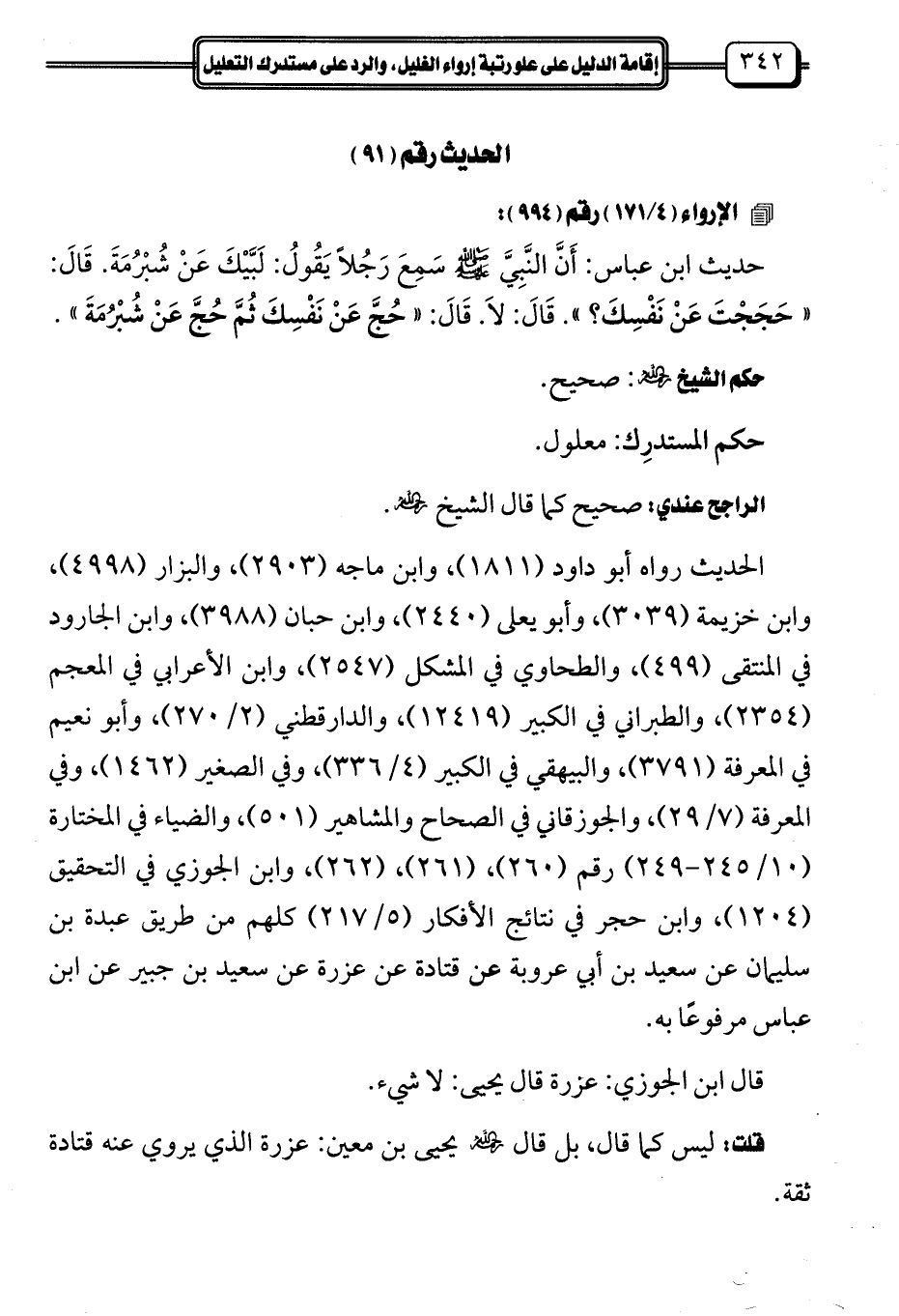 حديث ابن عباس: أَنَّ النَّبِيَّ - صلى الله عليه وسلم - سَمِعَ رَجُلاً يَقُولُ: لَبَّيْكَ عَنْ شُبْرُمَةَ. قَالَ: "حَجَجْتَ عَنْ نَفْسِكَ؟ ". قَالَ: لاَ. قَالَ: "حُجَّ عَنْ نَفْسِكَ ثُمَّ حُجَّ عَنْ شُبْرُمَةَ".