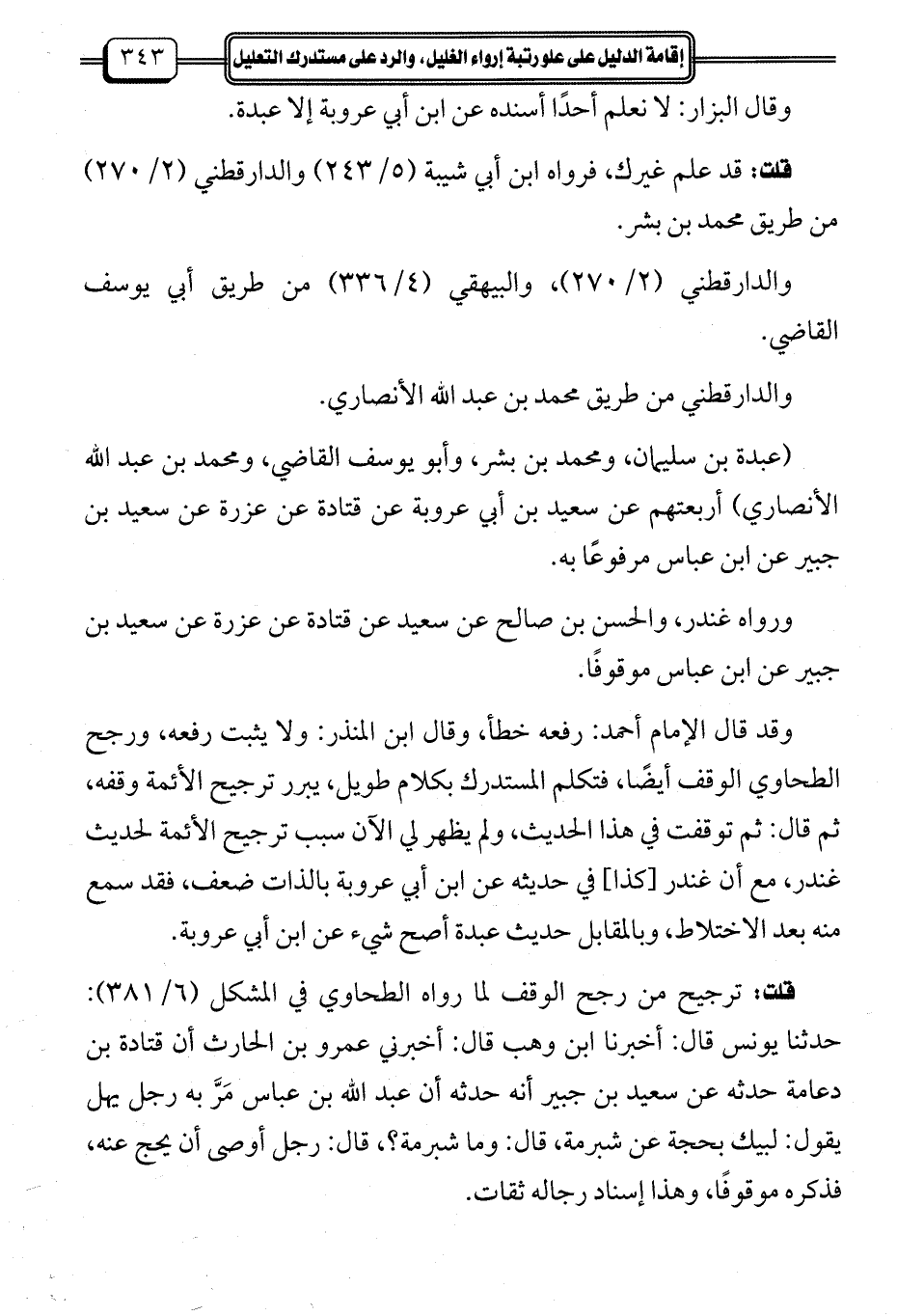 وقد قال الإِمام أحمد: رفعه خطأ، وقال ابن المنذر: ولا يثبت رفعه، ورجح الطحاوي الوقف أيضًا، فتكلم المستدرك بكلام طويل، يبرر ترجيح الأئمة وقفه، ثم قال: ثم توقفت في هذا الحديث، ولم يظهر لي الآن سبب ترجيح الأئمة لحديث غندر، مع أن غندر [كذا] في حديثه عن ابن أبي عروبة بالذات ضعف، فقد سمع منه بعد الاختلاط، وبالمقابل حديث عبدة أصح شيء عن ابن أبي عروبة.