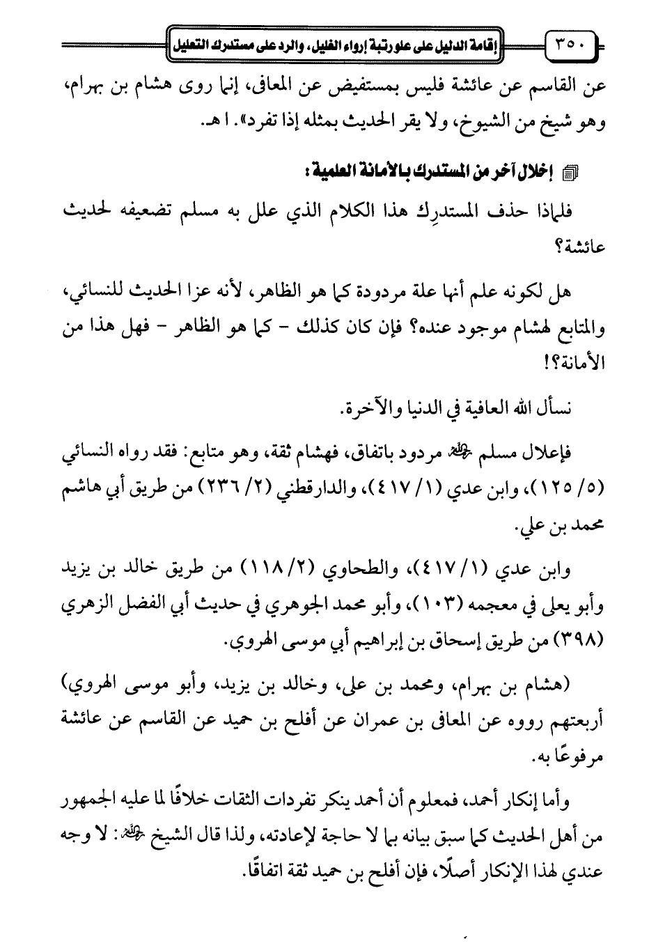 فإعلال مسلم رحمه الله مردود باتفاق، فهشام ثقة، وهو متابع: فقد رواه النسائي (5/ 125)، وابن عدي (1/ 417)، والدارقطني (2/ 236) من طريق أبي هاشم محمد بن علي.