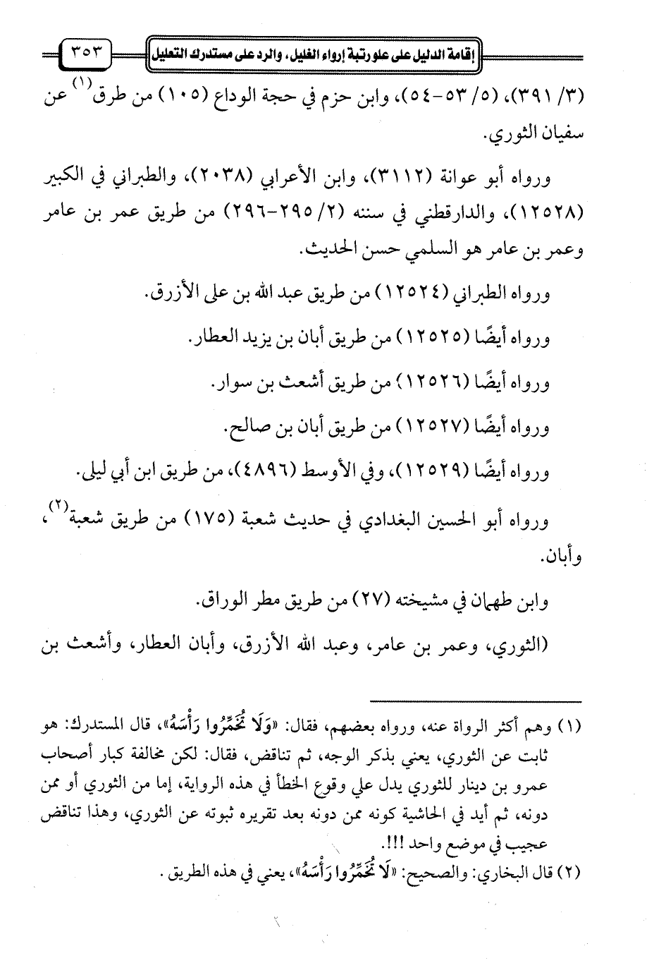 (¬1) وهم أكثر الرواة عنه، ورواه بعضهم، فقال: "وَلَا تُخمِّرُوا رَأْسَهُ"، قال المستدرك: هو ثابت عن الثوري، يعني بذكر الوجه، ثم تناقض، فقال: لكن مخالفة كبار أصحاب عمرو بن دينار للثوري يدل علي وقوع الخطأ في هذه الرواية، إما من الثوري أو ممن دونه، ثم أيد في الحاشية كونه ممن دونه بعد تقريره ثبوته عن الثوري، وهذا تناقض عجيب في موضع واحد!!!.