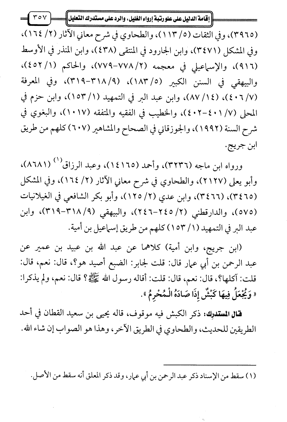 (ابن جريج، وابن أمية) كلاهما عن عبد الله بن عبيد بن عمير عن عبد الرحمن بن أبي عمار قال: قلت: لجابر: الضبع أصيد هو؟، قال: نعم، قال: قلت: آكلها؟، قال: نعم، قال: قلت: أقاله رسول الله -صلى الله عليه وسلم -؟ قال: نعم، ولم يذكرا: "وَيُجْعَلُ فِيهَا كَبْشٌ إِذَا صَادَهُ الْمُحْرِمُ".