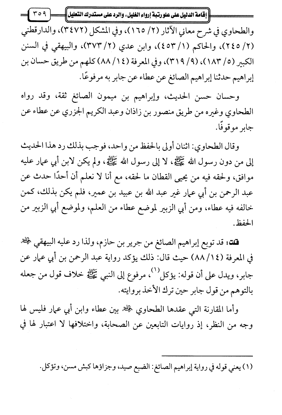 قلت: قد توبع إبراهيم الصائغ من جرير بن حازم، ولذا رد عليه البيهقي رحمه الله في المعرفة (14/ 88) حيث قال: ذلك يؤكد رواية عبد الرحمن بن أبي عمار عن جابر، ويدل على أن قوله: يؤكل (¬1)، مرفوع إلى النبي - صلى الله عليه وسلم - خلاف قول من جعله بالتوهم من قول جابر حين ترك الأخذ بروايته.