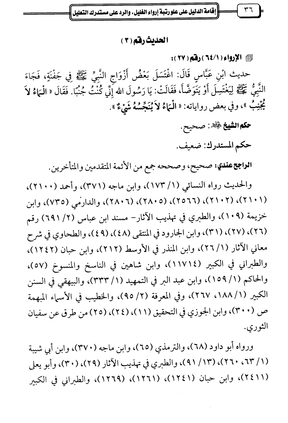 حديث ابْنِ عَبَّاسٍ قَالَ: اغْتَسَلَ بَعْضُ أَزْوَاجِ النَّبِيِّ - صلى الله عليه وسلم - فِي جَفْنَةٍ، فَجَاءَ النَّبِيُّ- صلى الله عليه وسلم - لِيَغْتَسِلَ أَوْ يَتَوَضَّأَ، فَقَالَتْ: يَا رَسُولَ الله إِنِّي كُنْتُ جُنُباً. فَقَالَ "الْمَاءُ لاَ يُجْنِبُ"، وفي بعض رواياته: "الْمَاءُ لاَ يُنَجِّسُهُ شَيْءٌ".