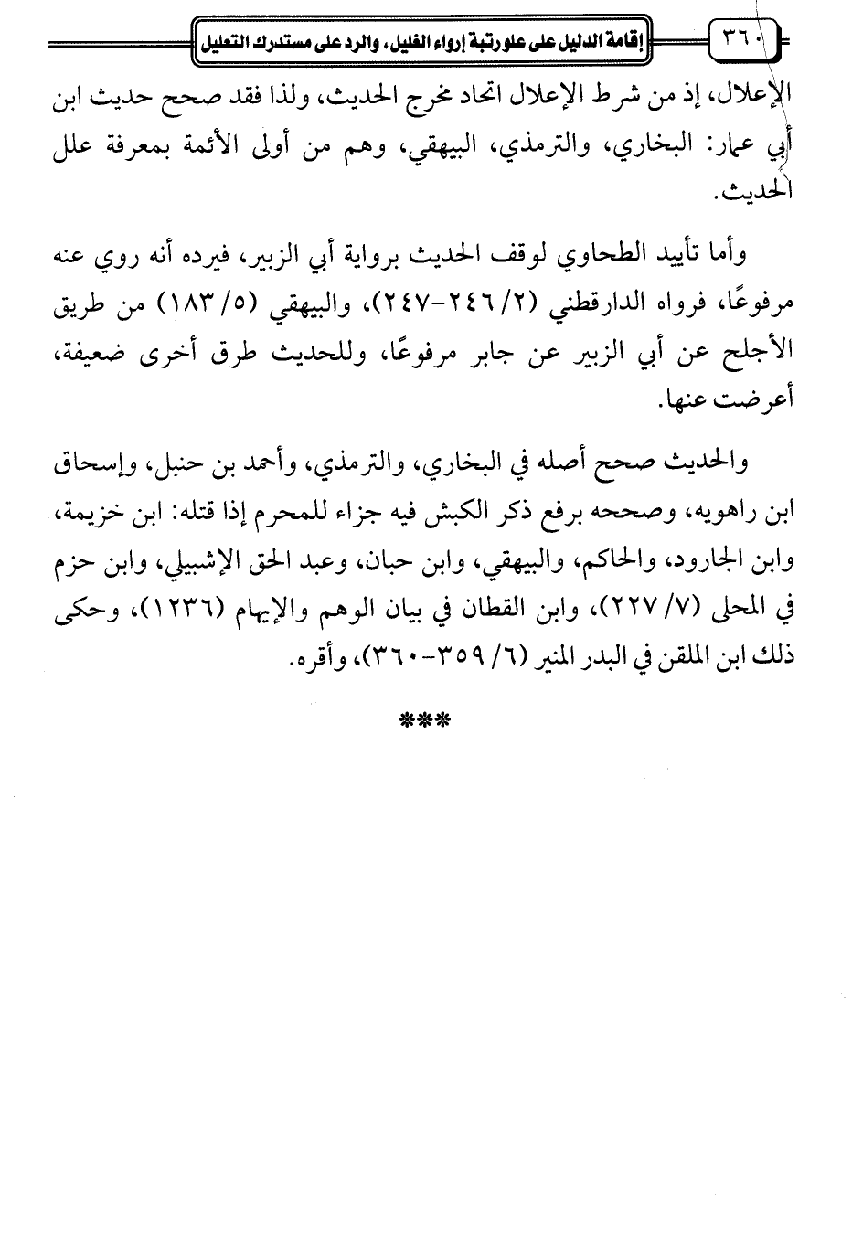 والحديث صحح أصله في البخاري، والترمذي، وأحمد بن حنبل، وإسحاق ابن راهويه، وصححه برفع ذكر الكبش فيه جزاء للمحرم إذا قتله: ابن خزيمة، وابن الجارود، والحاكم، والبيهقي، وابن حبان، وعبد الحق الإشبيلي، وابن حزم في المحلى (7/ 227)، وابن القطان في بيان الوهم والإيهام (1236)، وحكى ذلك ابن الملقن في البدر المنير (6/ 359 - 360)، وأقره.