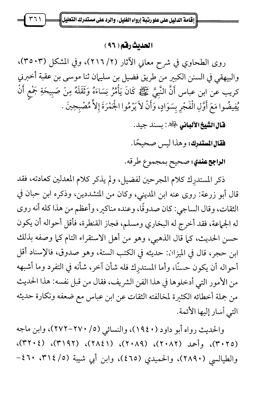 ذكر المستدرِك كلام المجرحين لفضيل، ولم يذكر كلام المعدلين كعادته، فقد قال أبو زرعة: روى عنه ابن المديني، وكان من المتشددين، وذكره ابن حبان في الثقات، وقال الساجي: كان صدوقًا، وعنده مناكير، وأعظم من هذا كله أنه روى له الجماعة، فقد أخرج له البخاري ومسلم، فجاز القنطرة، فأقل أحواله أن يكون حسن الحديث، كما قال الذهبي، وهو من أهل الاستقراء التام كما وصفه بذلك ابن حجر، قال في الميزان: حديثه في الكتب الستة، وهو صدوق، فالإسناد أقل أحواله أن يكون حسناً، وأما المستدرِك فله شأن آخر، شأنه في التفرد وما أشبهه من الأمور التي أدخلوها في هذا الفن الشريف، فقال من قبل نفسه: هذا الحديث من جملة أخطائه الكثيرة لمخالفته الثقات عن ابن عباس مع ضعفه ونكارة حديثه التي أَشار إليها الأئمة.