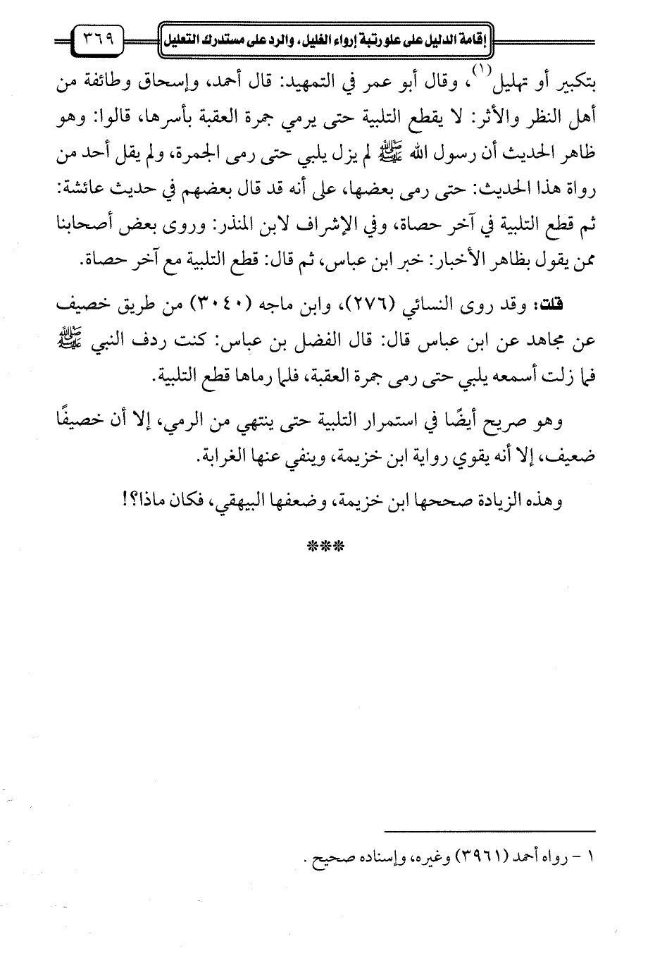 وهو صريح أيضًا في استمرار التلبية حتى ينتهي من الرمي، إلا أن خصيفًا ضعيف، إلا أنه يقوي رواية ابن خزيمة، وينفي عنها الغرابة.