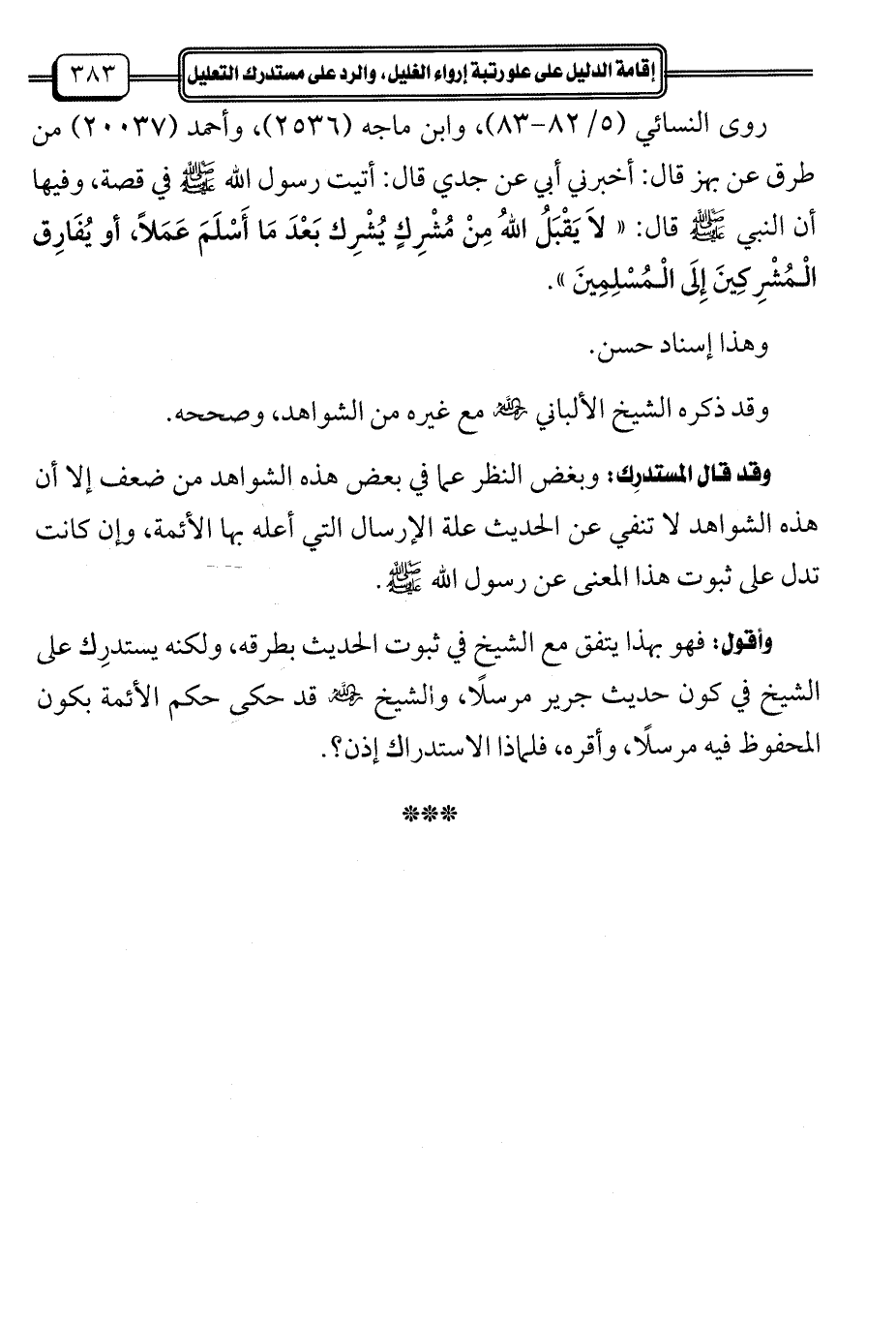 وأقول: فهو بهذا يتفق مع الشيخ في ثبوت الحديث بطرقه، ولكنه يستدرِك على الشيخ في كون حديث جرير مرسلاً، والشيخ رحمه الله قد حكى حكم الأئمة يكون المحفوظ فيه مرسلاً، وأقره، فلماذا الاستدراك إذن؟.
