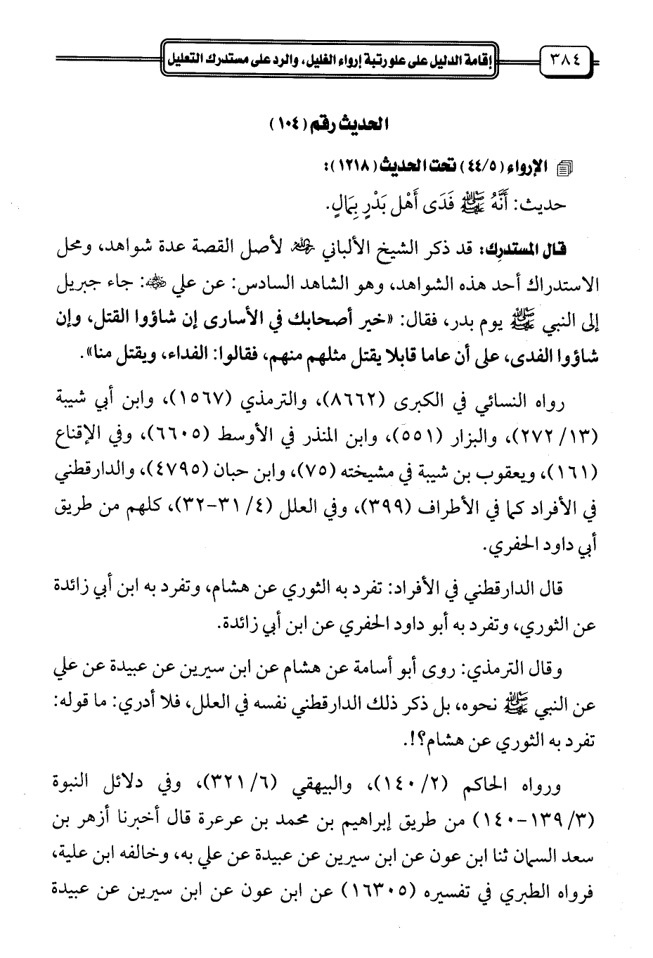 حديث: أنَّهُ - صلى الله عليه وسلم - فَدَى أَهْل بَدْرٍ بِمَالٍ.