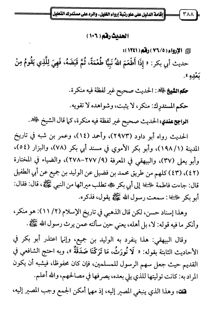 حديث أبي بكر: "إِذَا أَطْعَمَ اللهُ نَبِيًّا طُعْمَةً، ثُمَّ قَبَضَهُ، فَهِيَ لِلَّذِي يَقُومُ مِنْ بَعْدِهِ".