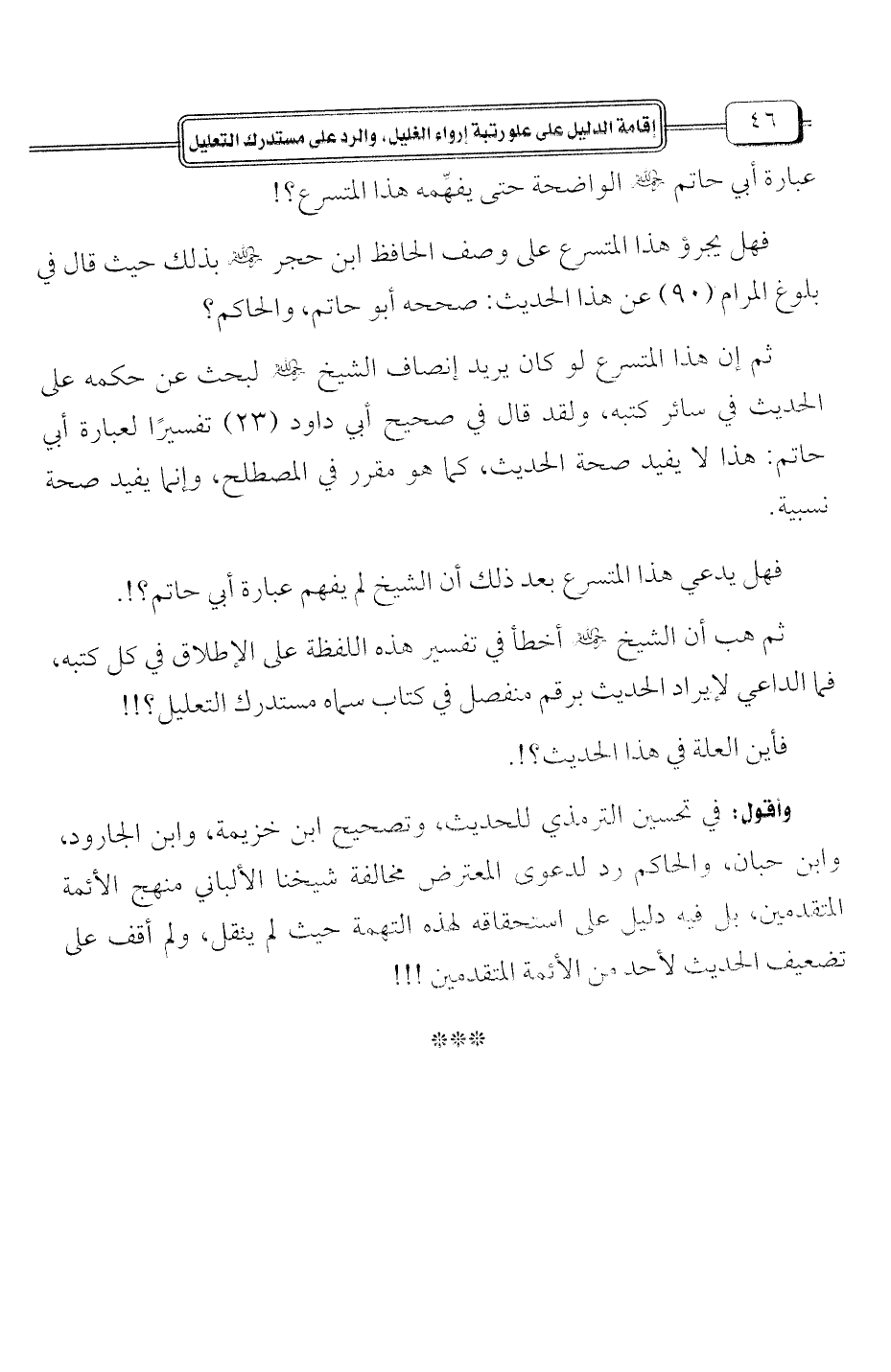 ثم هب أن الشيخ رحمه الله أخطأ في تفسير هذه اللفظة على الإطلاق في كل كتبه، فما الداعي لإيراد الحديث برقم منفصل في كتاب سماه مستدرك التعليل؟!