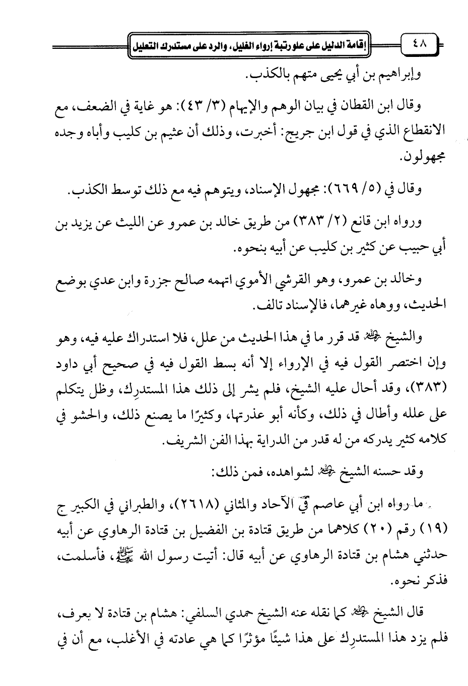 والشيخ رحمه الله قد قرر ما في هذا الحديث من علل، فلا استدراك عليه فيه، وهو وإن اختصر القول فيه في الإرواء إلا أنه بسط القول فيه في صحيح أبي داود (383)، وقد أحال عليه الشيخ، فلم يشر إلى ذلك هذا المستدرِك، وظل يتكلم على علله وأطال في ذلك، وكأنه أبو عذرتها، وكثيرًا ما يصنع ذلك، والحشو في كلامه كثير يدركه من له قدر من الدراية بهذا الفن الشريف.