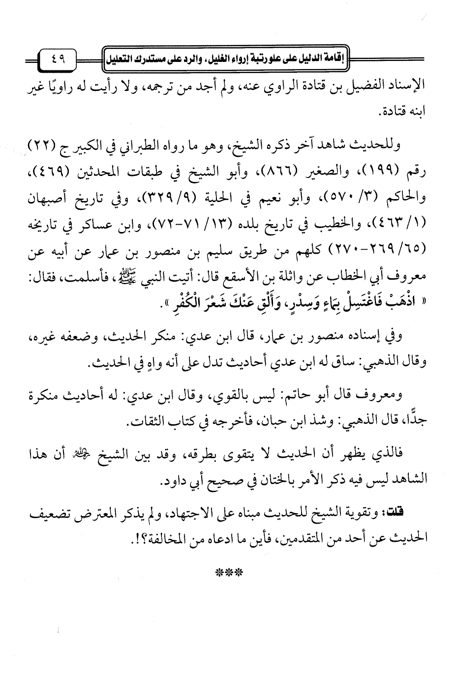 وللحديث شاهد آخر ذكره الشيخ، وهو ما رواه الطبراني في الكبير ج (22) رقم (199)، والصغير (866)، وأبو الشيخ في طبقات المحدثين (469)، والحاكم (3/ 570)، وأبو نعيم في الحلية (9/ 329)، وفي تاريخ أصبهان (1/ 463)، والخطيب في تاريخ بلده (13/ 71 - 72)، وابن عساكر في تاريخه (65/ 269 - 270) كلهم من طريق سليم بن منصور بن عمار عن أبيه عن معروف أبي الخطاب عن واثلة بن الأسقع قال: أتيت النبي- صلى الله عليه وسلم -، فأسلمت، فقال: "اذْهَبْ فَاغْتَسِلْ بِمَاءٍ وَسِدْرٍ، وَأَلْقِ عَنْكَ شَعْرَ الْكُفْرِ".
