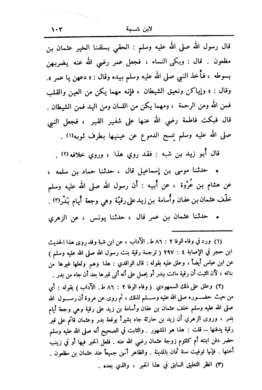 حَدَّثَنَا عُثْمَانُ بْنُ عُمَرَ قَالَ: حَدَّثَنَا يُونُسُ، عَنِ الزُّهْرِيِّ -[104]- قَالَ: " §قَسَمَ رَسُولُ اللَّهِ صَلَّى اللهُ عَلَيْهِ وَسَلَّمَ لِعُثْمَانَ يَوْمَ بَدْرٍ. قَالَ: وَكَانَ تَخَلَّفَ عَلَى امْرَأَتِهِ رُقَيَّةَ بِنْتِ رَسُولِ اللَّهِ صَلَّى اللهُ عَلَيْهِ وَسَلَّمَ، أَصَابَتْهَا الْحَصْبَةُ، فَجَاءَ زَيْدُ بْنُ حَارِثَةَ بَشِيرًا بِوَقْعَةِ بَدْرٍ، وَعُثْمَانُ رَضِيَ اللَّهُ عَنْهُ قَائِمٌ عَلَى قَبْرِ رُقَيَّةَ يَدْفِنُهَا