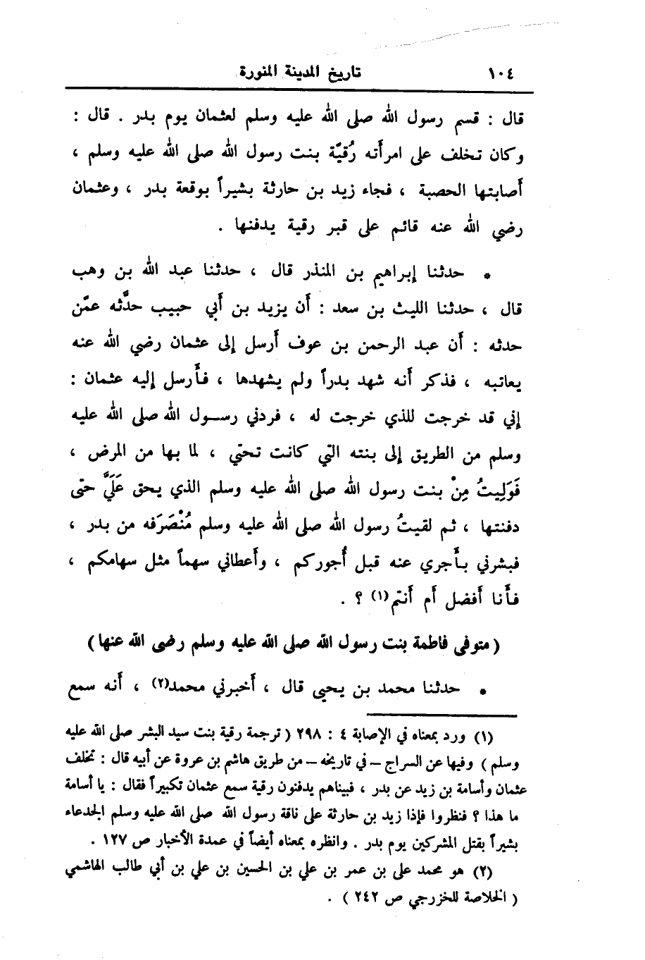 حَدَّثَنَا إِبْرَاهِيمُ بْنُ الْمُنْذِرِ قَالَ: حَدَّثَنَا عَبْدُ اللَّهِ بْنُ وَهْبٍ قَالَ: حَدَّثَنَا اللَّيْثُ بْنُ سَعْدٍ، أَنَّ يَزِيدَ بْنَ أَبِي حَبِيبٍ، حَدَّثَهُ، عَمَّنْ، حَدَّثَهُ، أَنَّ عَبْدَ الرَّحْمَنِ بْنَ عَوْفٍ أَرْسَلَ إِلَى عُثْمَانَ رَضِيَ اللَّهُ عَنْهُ يُعَاتِبُهُ، فَذَكَرَ أَنَّهُ شَهِدَ بَدْرًا وَلَمْ يَشْهَدْهَا، فَأَرْسَلَ إِلَيْهِ عُثْمَانُ: «إِنِّي §قَدْ خَرَجْتُ لِلَّذِي خَرَجْتَ لَهُ، فَرَدَّنِي رَسُولُ اللَّهِ صَلَّى اللهُ عَلَيْهِ وَسَلَّمَ مِنَ الطَّرِيقِ إِلَى بِنْتِهِ الَّتِي كَانَتْ تَحْتِي، لِمَا بِهَا مِنَ الْمَرَضِ، فَوَلِيتُ مِنْ بِنْتِ رَسُولِ اللَّهِ صَلَّى اللهُ عَلَيْهِ وَسَلَّمَ الَّذِي يَحِقُّ عَلَيَّ حَتَّى دَفَنْتُهَا، ثُمَّ لَقِيتُ رَسُولَ اللَّهِ صَلَّى اللهُ عَلَيْهِ وَسَلَّمَ مُنْصَرَفَهُ مِنْ بَدْرٍ، فَبَشَّرَنِي بِأَجْرِي عَنْهُ قَبْلَ أُجُورِكُمْ، وَأَعْطَانِي سَهْمًا مِثْلَ سِهَامِكُمْ، فَأَنَا أَفْضَلُ أَمْ أَنْتُمْ؟»