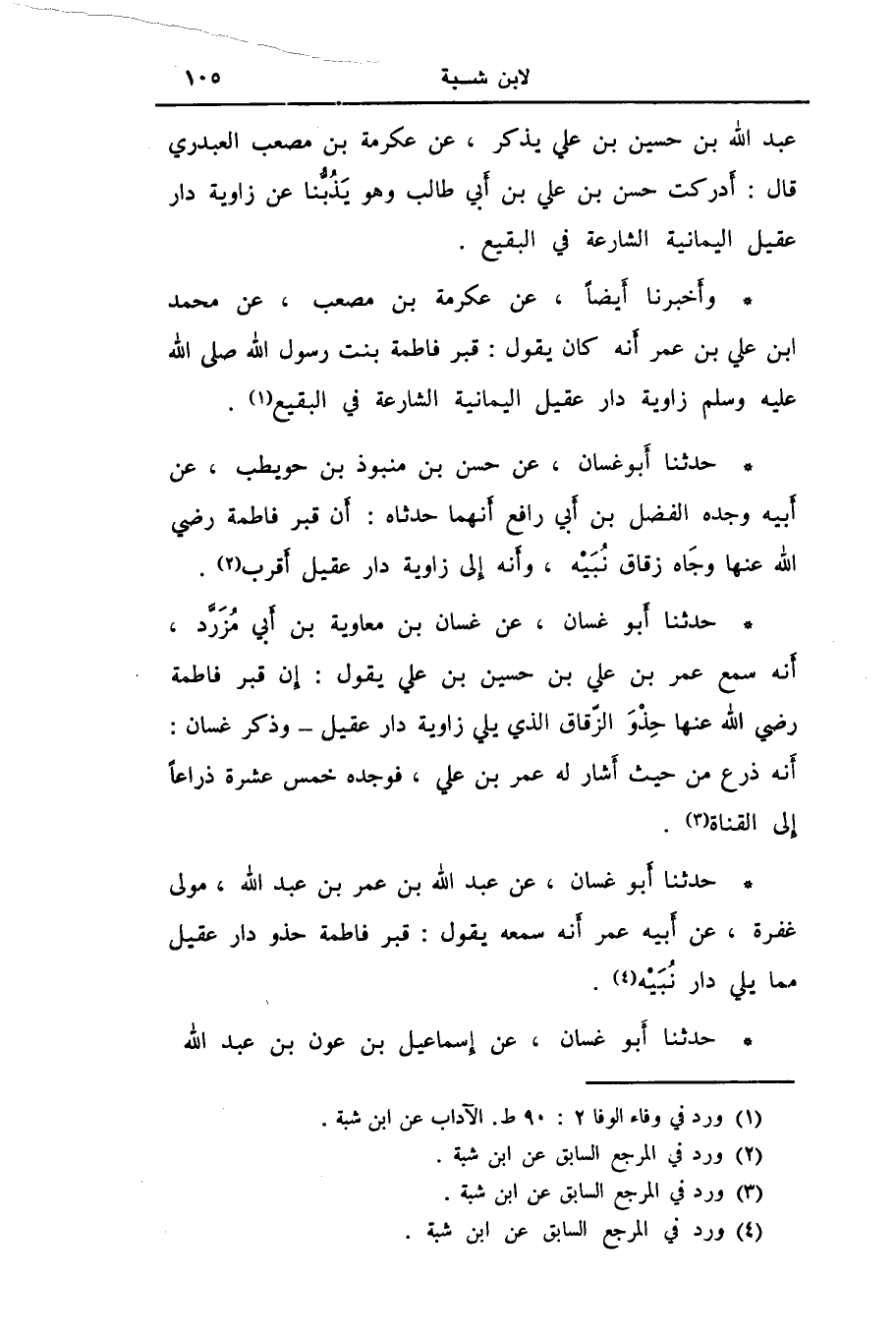 حَدَّثَنَا أَبُو غَسَّانَ، عَنِ حَسَنِ بْنِ مَنْبُوذِ بْنِ حُوَيْطِبٍ، عَنْ أَبِيهِ، وَجَدِّهِ الْفَضْلِ بْنِ أَبِي رَافِعٍ، أَنَّهُمَا حَدَّثَاهُ: «أَنَّ §قَبْرَ فَاطِمَةَ رَضِيَ اللَّهُ عَنْهَا وِجَاهَ زُقَاقِ نُبَيْهٍ، وَأَنَّهُ إِلَى زَاوِيَةِ دَارِ عَقِيلٍ أَقْرَبُ»