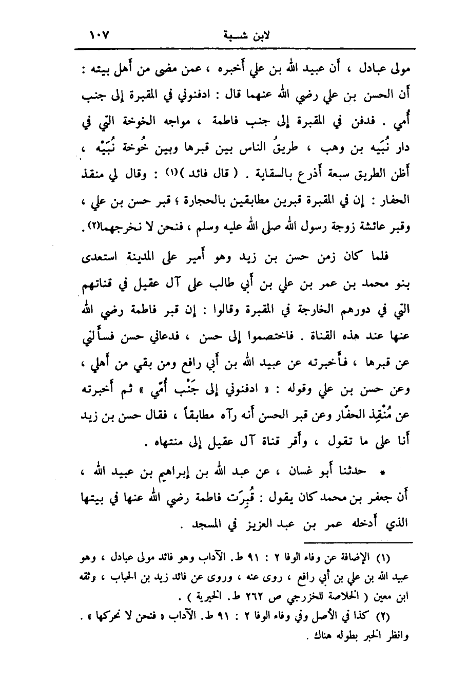 حَدَّثَنَا أَبُو غَسَّانَ، عَنْ عَبْدِ اللَّهِ بْنِ إِبْرَاهِيمَ بْنِ عُبَيْدِ اللَّهِ، أَنَّ جَعْفَرَ بْنَ مُحَمَّدٍ، كَانَ يَقُولُ: «§قُبِرَتْ فَاطِمَةُ رَضِيَ اللَّهُ عَنْهَا فِي بَيْتِهَا الَّذِي أَدْخَلَهُ عُمَرُ بْنُ عَبْدِ الْعَزِيزِ فِي الْمَسْجِدِ» -[108]- فَهَذَا مَا حَدَّثَنِي بِهِ أَبُو غَسَّانَ فِي قَبْرِ فَاطِمَةَ، وَوَجَدْتُ كِتَابًا كُتِبَ عَنْهُ يَذْكُرُ فِيهِ أَنَّ عَبْدَ الْعَزِيزِ بْنَ عِمْرَانَ كَانَ يَقُولُ: إِنَّهَا دُفِنَتْ فِي بَيْتِهَا، وَصُنِعَ بِهَا مَا صُنِعَ بِرَسُولِ اللَّهِ صَلَّى اللهُ عَلَيْهِ وَسَلَّمَ، إِنَّهَا دُفِنَتْ فِي مَوْضِعِ فِرَاشِهَا، وَيَحْتَجُّ بِأَنَّهَا دُفِنَتْ لَيْلًا وَلَا يَعْلَمُ بِهَا كَثِيرٌ مِنَ النَّاسِ