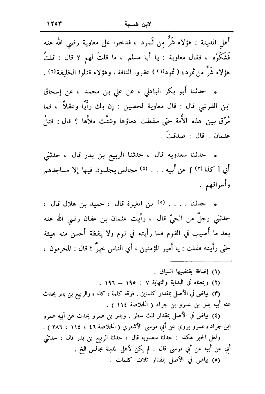 حَدَّثَنَا أَبُو بَكْرٍ الْبَاهِلِيُّ، عَنْ عَلِيِّ بْنِ مُحَمَّدٍ، عَنْ إِسْحَاقَ بْنِ الْقُرَشِيِّ، قَالَ: قَالَ مُعَاوِيَةُ لِحُصَيْنٍ: إِنَّ §بِكَ رَأَيًا وَعَقْلًا، فَمَا مُرِقَ بَيْنَ هَذِهِ الْأُمَّةِ حَتَّى سَقَطَتْ دِمَاؤُهَا وَشُتِّتَ مَلَأُهَا؟ قَالَ: قَتْلُ عُثْمَانَ. قَالَ: صَدَقْتَ حَدَّثَنَا سَعْدَوَيْهِ، قَالَ: حَدَّثَنَا الرَّبِيعُ بْنُ بَدْرٍ، قَالَ: حَدَّثَنِي أَبِي كَذَا، عَنْ أَبِيهِ،. . . . . . . . مَجَالِسَ يَجْلِسُونَ فِيهَا إِلَّا مَسَاجِدَهُمْ وَأَسْوَاقَهُمْ