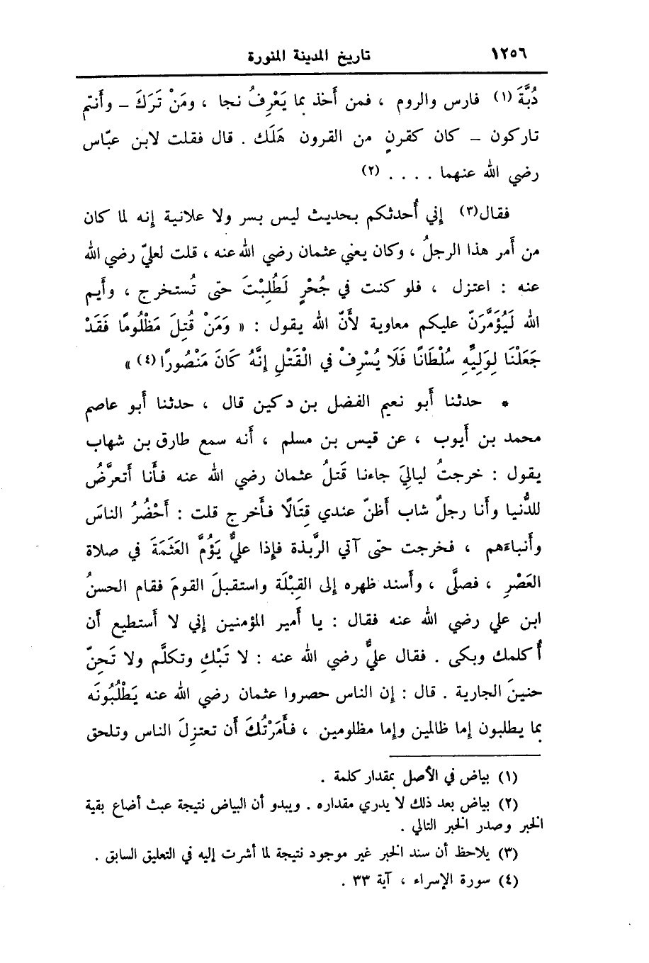 حَدَّثَنَا أَبُو نُعَيْمٍ الْفَضْلُ بْنُ دُكَيْنٍ، قَالَ: حَدَّثَنَا أَبُو عَاصِمٍ مُحَمَّدُ بْنُ أَيُّوبَ عَنْ قَيْسِ بْنِ مُسْلِمٍ، أَنَّهُ سَمِعَ طَارِقَ بْنَ شِهَابٍ يَقُولُ: خَرَجْتُ لَيَالِيَ جَاءَنَا قَتْلُ عُثْمَانَ رَضِيَ اللَّهُ عَنْهُ فَأَنَا أَتَعَرَّضُ لِلدُّنْيَا وَأَنَا رَجُلٌ شَابٌّ أَظُنُّ عِنْدِي قِتَالًا فَأَخْرُجُ، قُلْتُ: أَحْضُرُ النَّاسَ وَأَنْبَاءَهُمْ، فَخَرَجْتُ حَتَّى آتِيَ الرَّبَذَةَ فَإِذَا عَلِيٌّ يَؤُمُّ الْعَثَمَةَ فِي صَلَاةِ الْعَصْرِ، فَصَلَّى وَأَسْنَدَ ظَهْرَهُ إِلَى الْقِبْلَةِ وَاسْتَقْبَلَ الْقَوْمَ فَقَامَ الْحَسَنُ بْنُ عَلِيٍّ رَضِيَ اللَّهُ عَنْهُ فَقَالَ: يَا أَمِيرَ الْمُؤْمِنِينَ إِنِّي لَا أَسْتَطِيعُ أَنْ أُكَلِّمَكَ، وَبَكَى، فَقَالَ عَلِيٌّ: رَضِيَ اللَّهُ عَنْهُ: لَا تَبْكِ وَتَكَلَّمْ وَلَا تَحِنَّ حَنِينَ الْجَارِيَةِ. قَالَ: إِنَّ §النَّاسَ حَصَرُوا عُثْمَانَ رَضِيَ اللَّهُ عَنْهُ يَطْلُبُونَهُ بِمَا يَطْلُبُونَ إِمَّا ظَالِمِينَ وَإِمَّا مَظْلُومِينَ، فَأَمَرْتُكَ أَنْ تَعْتَزِلَ النَّاسَ وَتَلْحَقَ