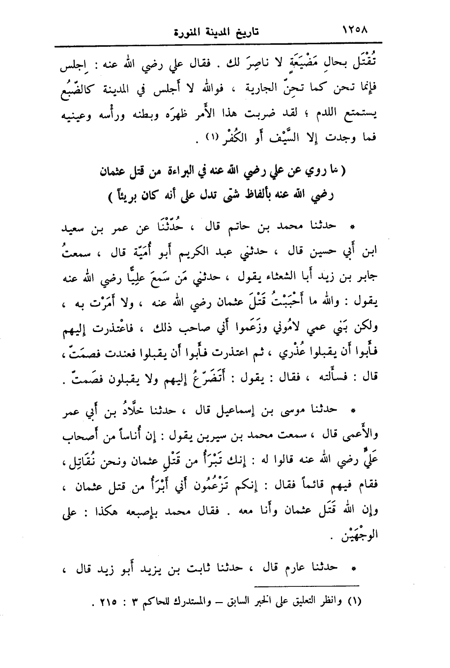 حَدَّثَنَا مُحَمَّدُ بْنُ حَاتِمٍ، قَالَ: حُدَّثَنَا عَنْ عُمَرَ بْنِ سَعِيدِ بْنِ أَبِي حُسَيْنٍ، قَالَ: حَدَّثَنِي عَبْدُ الْكَرِيمِ أَبُو أُمَيَّةَ، قَالَ: سَمِعْتُ جَابِرَ بْنَ زَيْدٍ أَبَا الشَّعْثَاءِ، يَقُولُ: حَدَّثَنِي مَنْ، سَمِعَ عَلِيًّا رَضِيَ اللَّهُ عَنْهُ يَقُولُ: " وَاللَّهِ §مَا أَحْبَبْتُ قَتْلَ عُثْمَانَ رَضِيَ اللَّهُ عَنْهُ، وَلَا أَمَرْتُ بِهِ، وَلَكِنْ بَنِي عَمِّي لَامُونِي وَزَعَمُوا أَنِّي صَاحِبُ ذَلِكَ، فَاعْتَذَرْتُ إِلَيْهِمْ فَأَبَوْا أَنْ يَقْبَلُوا عُذْرِي، ثُمَّ اعْتَذَرْتُ فَأَبَوْا أَنْ يَقْبَلُوا فَعَنِدْتُ فَصَمَتُّ قَالَ: فَسَأَلْتُهُ، فَقَالَ: يَقُولُ: أَتَضَرَّعُ إِلَيْهِمْ وَلَا يَقْبَلُونَ فَصَمَتُّ "