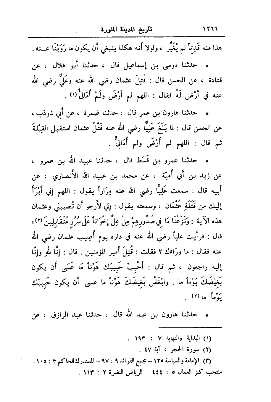 حَدَّثَنَا مُوسَى بْنُ إِسْمَاعِيلَ، قَالَ: حَدَّثَنَا أَبُو هِلَالٍ، عَنْ قَتَادَةَ، عَنِ الْحَسَنِ، قَالَ: قُتِلَ عُثْمَانُ رَضِيَ اللَّهُ عَنْهُ وَعَلِيٌّ رَضِيَ اللَّهُ عَنْهُ فِي أَرْضٍ لَهُ فَقَالَ: «§اللَّهُمَّ لَمْ أَرْضَ وَلَمْ أُمَالِئْ»