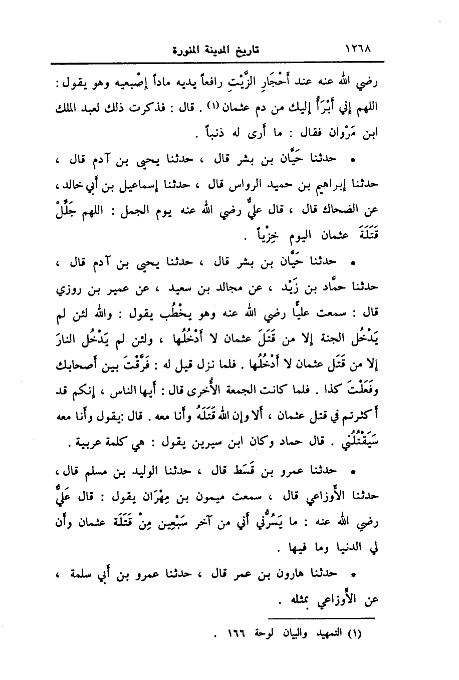 حَدَّثَنَا حَيَّانُ بْنُ بِشْرٍ، قَالَ: حَدَّثَنَا يَحْيَى بْنُ آدَمَ، قَالَ: حَدَّثَنَا حَمَّادُ بْنُ زَيْدٍ، عَنْ مُجَالِدِ بْنِ سَعِيدٍ، عَنْ عُمَيْرِ بْنِ رُوزِيٍّ، قَالَ: سَمِعْتُ عَلِيًّا رَضِيَ اللَّهُ عَنْهُ وَهُوَ يَخْطُبُ يَقُولُ: «وَاللَّهِ §لَئِنْ لَمْ يَدْخُلِ الْجَنَّةَ إِلَّا مَنْ قَتَلَ عُثْمَانَ لَا أَدْخُلُهَا، وَلَئِنْ لَمْ يَدْخُلِ النَّارَ إِلَّا مَنْ قَتَلَ عُثْمَانَ لَا أَدْخُلُهَا» . فَلَمَّا نَزَلَ قِيلَ لَهُ: فَرَّقْتَ بَيْنَ أَصْحَابِكَ وَفَعَلْتَ كَذَا. فَلَمَّا كَانَتِ الْجُمُعَةُ الْأُخْرَى قَالَ: «أَيُّهَا النَّاسُ، إِنَّكُمْ قَدْ أَكْثَرْتُمْ فِي قَتْلِ عُثْمَانَ، أَلَا وَإِنَّ اللَّهَ قَتَلَهُ وَأَنَا مَعَهُ» . قَالَ: يَقُولُ: وَأَنَا مَعَهُ سَيَقْتُلُنِي. قَالَ حَمَّادٌ: وَكَانَ ابْنُ سِيرِينَ يَقُولُ: هِيَ كَلِمَةٌ عَرَبِيَّةٌ