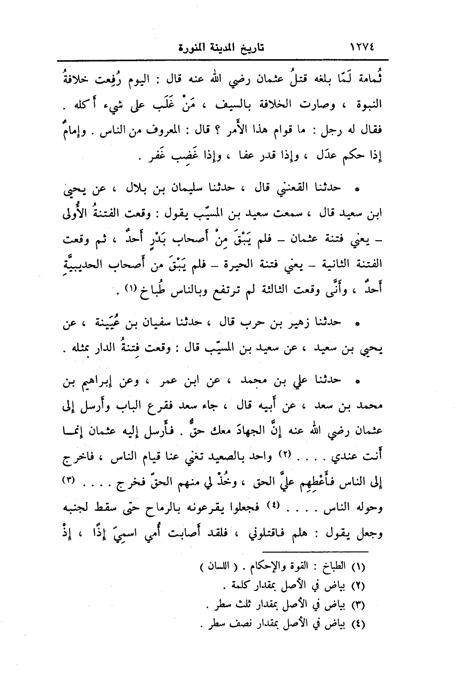 حَدَّثَنَا الْقَعْنَبِيُّ قَالَ: حَدَّثَنَا سُلَيْمَانُ بْنُ بِلَالٍ، عَنْ يَحْيَى بْنِ سَعِيدٍ قَالَ: سَمِعْتُ سَعِيدَ بْنَ الْمُسَيِّبِ يَقُولُ: «§وَقَعَتِ الْفِتْنَةُ الْأُولَى - يَعْنِي فِتْنَةَ عُثْمَانَ - فَلَمْ يَبْقَ مِنْ أَصْحَابِ بَدْرٍ أَحَدٌ، ثُمَّ وَقَعَتِ الْفِتْنَةُ الثَّانِيَةُ - يَعْنِي فِتْنَةَ الْحِيرَةِ - فَلَمْ يَبْقَ مِنْ أَصْحَابِ الْحُدَيْبِيَةِ أَحَدٌ، وَأَنَّى وَقَعَتِ الثَّالِثَةُ لَمْ تَرْتَفِعْ وَبِالنَّاسِ طُبَاخٌ» . حَدَّثَنَا زُهَيْرُ بْنُ حَرْبٍ قَالَ: حَدَّثَنَا سُفْيَانُ بْنُ عُيَيْنَةَ، عَنْ يَحْيَى بْنِ سَعِيدٍ، عَنْ سَعِيدِ بْنِ الْمُسَيِّبِ قَالَ: وَقَعَتْ فِتْنَةُ الدَّارِ بِمِثْلِهِ
