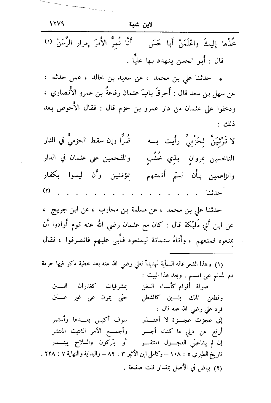 حَدَّثَنَا عَلِيُّ بْنُ مُحَمَّدٍ، عَنْ سَعِيدِ بْنِ خَالِدٍ، عَمَّنْ حَدَّثَهُ، عَنْ سَهْلِ بْنِ سَعْدٍ قَالَ: §أَحْرَقَ بَابَ عُثْمَانَ رِفَاعَةُ بْنُ عَمْرٍو الْأَنْصَارِيُّ، وَدَخَلُوا عَلَى عُثْمَانَ مِنْ دَارِ عَمْرِو بْنِ حَزْمٍ قَالَ: فَقَالَ الْأَحْوَصُ بَعْدَ ذَلِكَ: